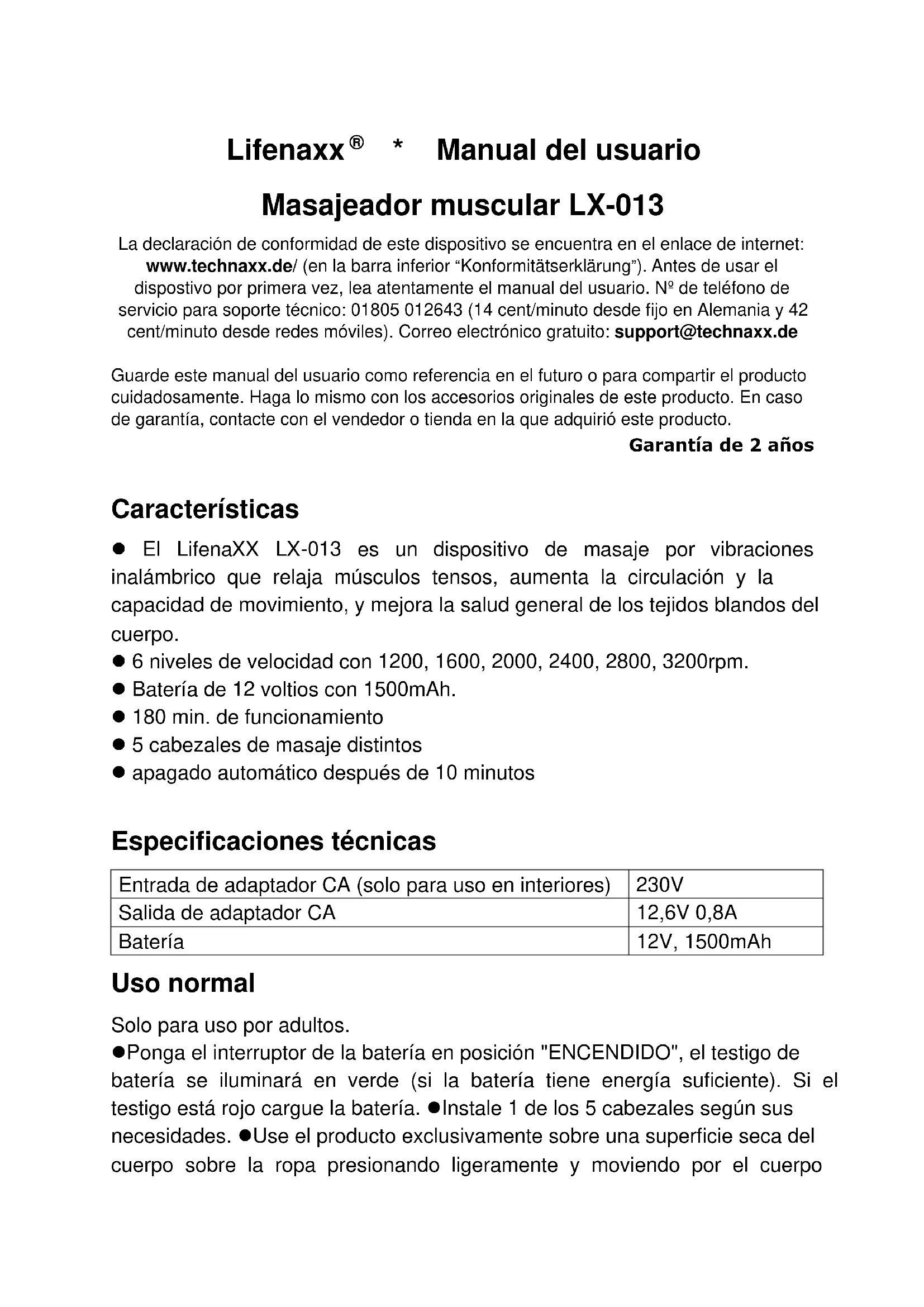 - Manual del usuario Masajeador muscular LX-013 La declaración de conformidad de este dispositivo se encuentra en el enlace de internet: www.technaxx.de/ (en la barra inferior “Konformitätserklärung”). Antes de usar el dispostivo por primera vez, lea atentamente el manual del usuario. Nº de teléfono de servicio para soporte técnico: 01805 012643 (14 cent/minuto desde fijo en Alemania y 42 cent/minuto desde redes móviles). Correo electrónico gratuito: support@technaxx.de Guarde este manual del usuario como referencia en el futuro o para compartir el producto cuidadosamente. Haga lo mismo con los accesorios originales de este producto. En caso de garantía, contacte con el vendedor o tienda en la que adquirió este producto. Garantía de 2 años Características ⚫ El LifenaXX LX-013 es un dispositivo de masaje por vibraciones inalámbrico que relaja músculos tensos, aumenta la circulación y la capacidad de movimiento, y mejora la salud general de los tejidos blandos del cuerpo. ⚫ 6 niveles de velocidad con 1200, 1600, 2000, 2400, 2800, 3200rpm. ⚫ Batería de 12 voltios con 1500mAh. ⚫ 180 min. de funcionamiento ⚫ 5 cabezales de masaje distintos ⚫ apagado automático después de 10 minutos Especificaciones técnicas Entrada de adaptador CA (solo para uso en interiores) 230V Salida de adaptador CA 12,6V 0,8A Batería 12V, 1500mAh Uso normal Solo para uso por adultos. ⚫Ponga el interruptor de la batería en posición "ENCENDIDO", el testigo de batería se iluminará en verde (si la batería tiene energía suficiente). Si el testigo está rojo cargue la batería. ⚫Instale 1 de los 5 cabezales según sus necesidades. ⚫Use el producto exclusivamente sobre una superficie seca del cuerpo sobre la ropa presionando ligeramente y moviendo por el cuerpo2