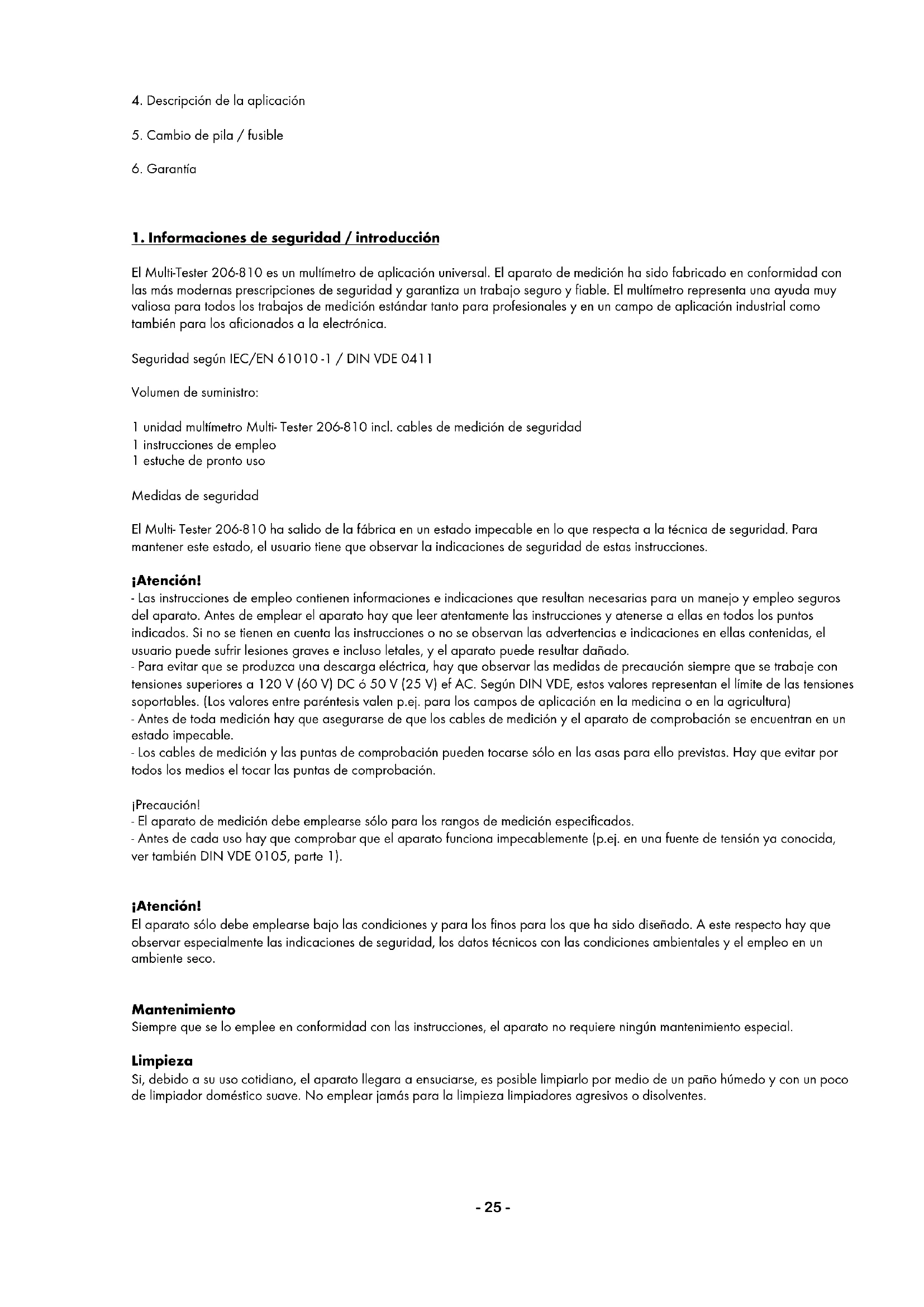 Seguridad según IEC/EN 61010 -1 / DIN VDE 0411 Volumen de suministro: 1 unidad multímetro Multi- Tester 206-810 incl. cables de medición de seguridad 1 instrucciones de empleo 1 estuche de pronto uso Medidas de seguridad El Multi- Tester 206-810 ha salido de la fábrica en un estado impecable en lo que respecta a la técnica de seguridad. Para mantener este estado, el usuario tiene que observar la indicaciones de seguridad de estas instrucciones.