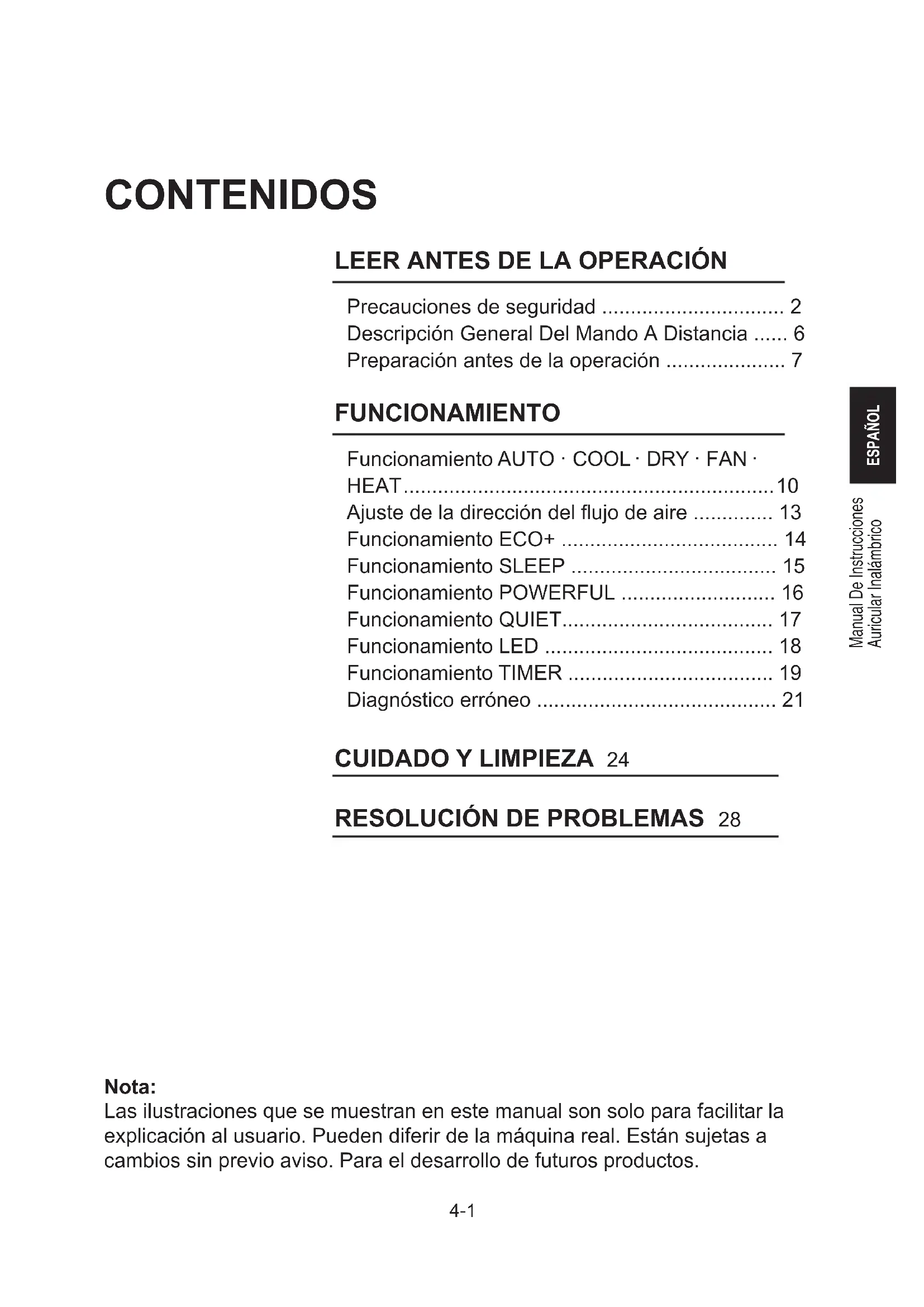 verständigen. Sollte der Fehler weiter fortbestehen, wenden Sie sich bitte an Ihren örtlichen Händler / Kundendienst.Manual De Instrucciones Auricular Inalámbrico ESPAÑOL 4-1 Nota: Las ilustraciones que se muestran en este manual son solo para facilitar la explicación al usuario. Pueden diferir de la máquina real. Están sujetas a cambios sin previo aviso. Para el desarrollo de futuros productos. CONTENIDOS