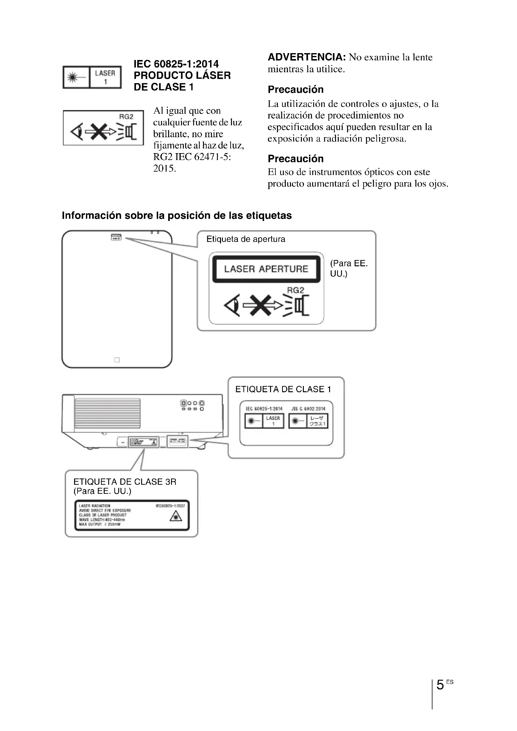 ADVERTENCIA: No examine la lente mientras la utilice. Precaución La utilización de controles o ajustes, o la realización de procedimientos no especificados aquí pueden resultar en la exposición a radiación peligrosa. Precaución El uso de instrumentos ópticos con este producto aumentará el peligro para los ojos. Información sobre la posición de las etiquetas IEC 60825-1:2014