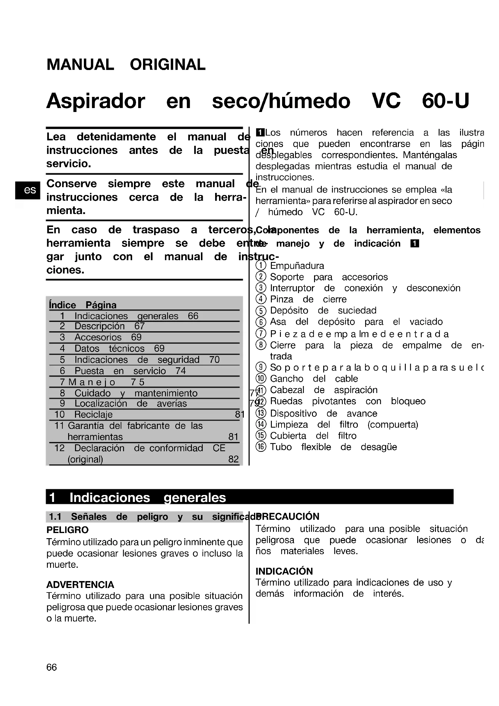 Printed: 05.12.2013 | Doc-Nr: PUB / 5071295 / 000 / 02MANUAL ORIGINAL Aspirador en seco/húmedo VC 60‑U Lea detenidamente el manual deinstrucciones antes de la puesta enservicio.Conserve siempre este manual deinstrucciones cerca de la herra-mienta.En caso de traspaso a terceros, laherramienta siempre se debe entre-gar junto con el manual de instruc-ciones.Índice Página1 Indicaciones generales 662 Descripción 673 Accesorios 694 Datos técnicos 695 Indicaciones de seguridad 706 Puesta en servicio 747Manejo 758 Cuidado y mantenimiento 779 Localización de averías 7910 Reciclaje 81 11 Garantía del fabricante de las herramientas 8112 Declaración de conformidad CE(original) 821 Los números hacen referencia a las ilustra-ciones que pueden encontrarse en las páginasdesplegables correspondientes. Manténgalas desplegadas mientras estudia el manual de instrucciones. En el manual de instrucciones se emplea «la herramienta» para referirse al aspirador en seco / húmedo VC 60‑U.Componentes de la herramienta, elementosde manejo y de indicación 1 Empuñadura Soporte para accesorios Interruptor de conexión y desconexión Pinza de cierre Depósito de suciedad Asa del depósito para el vaciado Piezadeempalmedeentrada Cierre para la pieza de empalme de en-trada Soporteparalaboquillaparasuelos Gancho del cable Cabezal de aspiración Ruedas pivotantes con bloqueo Dispositivo de avance Limpieza del filtro (compuerta) Cubierta del filtro Tubo flexible de desagüe 1 Indicaciones generales