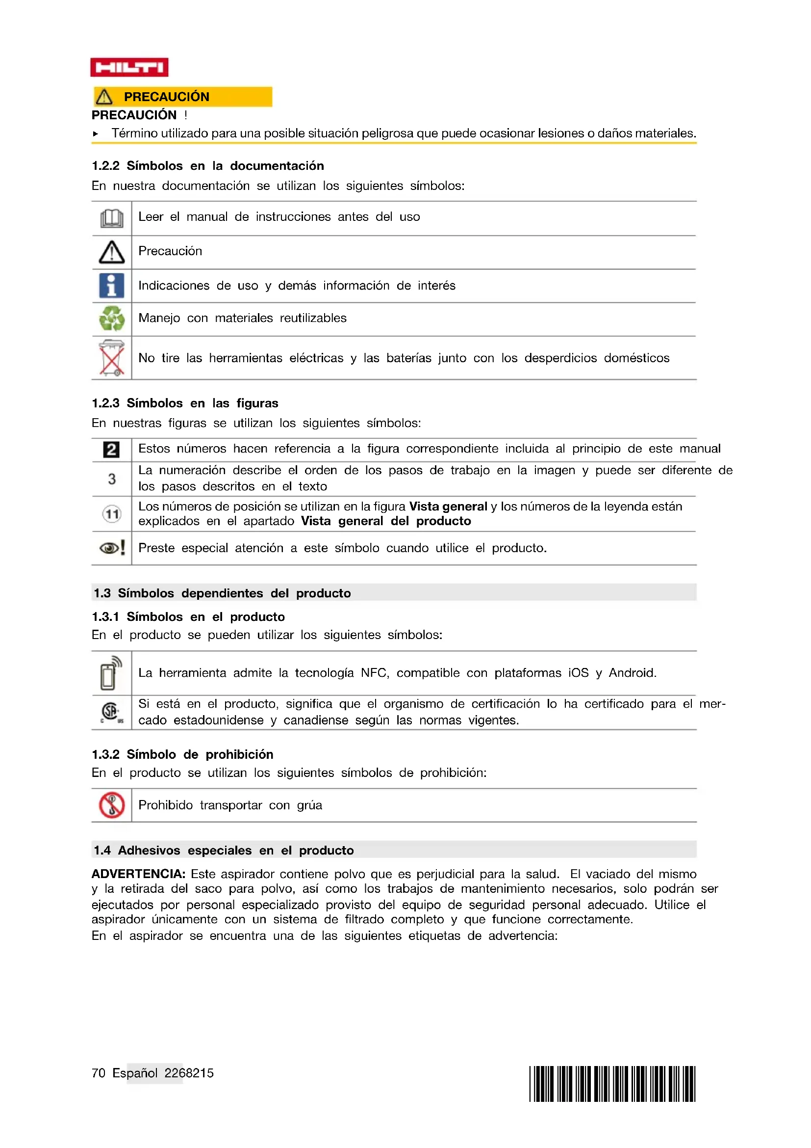 Los productos descritos aquí son aspiradores industriales universales destinados a uso industrial. Resultan adecuados para aplicaciones en seco y en húmedo. Está prohibido utilizar este producto con personas o animales. Está prohibido utilizar la herramienta bajo el agua. ▶ Antes de trabajar con el producto, infórmese sobre su manejo, los peligros relacionados con los materiales y el reciclaje seguro del material.*2268215* 2268215 Español 75 ▶ No utilice el producto con la marcha continua fija en instalaciones automáticas o semiautomáticas. ▶ Para evitar el riesgo de lesiones, utilice exclusivamente accesorios y herramientas originales de Hilti. ▶ Para evitar efectos electrostáticos, utilice una manguera de aspiración antiestática. ▶ No aspire objetos que puedan ocasionar daños a través del saco para polvo (por ejemplo, agujas o elementos afilados). ▶ No utilice el producto como escalera. ▶ Observe las disposiciones locales sobre prevención de accidentes. Aplicaciones permitidas: En los desempolvadores es necesario garantizar una tasa de renovación del aire L suficiente en la estancia si el aire de escape vuelve a dicha estancia. Respete la normativa nacional. ▶ Aspiración de grandes cantidades de polvo al trabajar con amoladoras de diamante, amoladoras tronzadoras, martillos perforadores y coronas perforadoras en seco Hilti. ▶ Aspiración del lodo mineral de perforación al trabajar con coronas perforadoras de diamante Hilti, sierras de diamante Hilti y material de aspiración líquido con una temperatura máxima de 60 °C (140 °F). ▶ Aspiración de aceite y sustancias líquidas con una temperatura máxima de 60 °C (140 °F). ▶ Limpieza en seco y en húmedo de paredes y suelos. VC 20M-X VC 40M-X De forma adicional en aspiradores M ▶ Aspiración de polvo seco no inflamable, líquidos, virutas de madera y polvos peligrosos con valores límite de exposición ≧0,1 mg/m³ (clase de polvo M). ▶ Las máquinas diseñadas para recoger el polvo mineral que contiene cuarzo deben cumplir al menos con la clase de polvo M. VC 20L-X VC 40L-X De forma adicional en aspiradores L ▶ aspiración de polvo seco no inflamable, líquidos, virutas de madera y polvos peligrosos con valores límite de exposición > 1 mg/m³ (clase de polvo L).