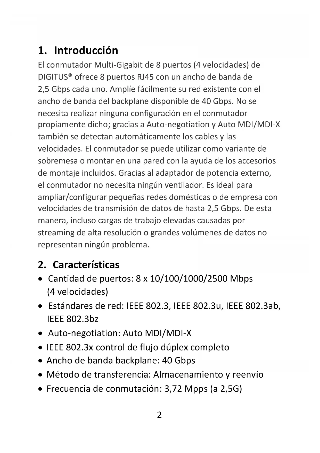 Puerto LAN 8 puertos RJ-45 Otros puertos 1 jack CC, 1 botón de reposo Indicadores LED 8 LED apilados G+G (2.5G Link/Act, 1000/100/100M Link/Act) 1 LED verde (potencia) Estándar Ethernet IEEE802.3: 100BASE-TX (802.3u) 1000BASE-T (802.3ab) 2.5G BASE-T (802.3bz) Velocidad de enlace 100BASE-TX: 100 Mbps 1000BASE-T: 1 Gbps 2.5G BASE-T: 2,5 Gbps Dúplex Compatible con dúplex/semidúplex Auto- negotiation Compatible en todos los puertos AutoMDI/MDI-X Compatible en todos los puertos Jumbo Frame Compatible (más de 9216 bytes) Tipo de conmutación Almacenamiento y reenvío Frecuencia de conmutación 100BASE-TX: 148.810 pps 1000BASE-T: 1.488.095 pps 2.5BASE-T: 3.720.238 pps Matriz de conmutación 40 Gbps6 Temperatura de funcionamiento 0 a 45 °C Temperatura de almacenamiento -10 a 60 °C Rango de humedad ~ 90 % Dimensiones (Anch. x prof. x alt.) 190 x 120 x 30 mm Color Negro Ventilador de refrigeración Sin (refrigeración por flujo de aire sin ventilador) Adaptador de potencia 12 V/1,8 A