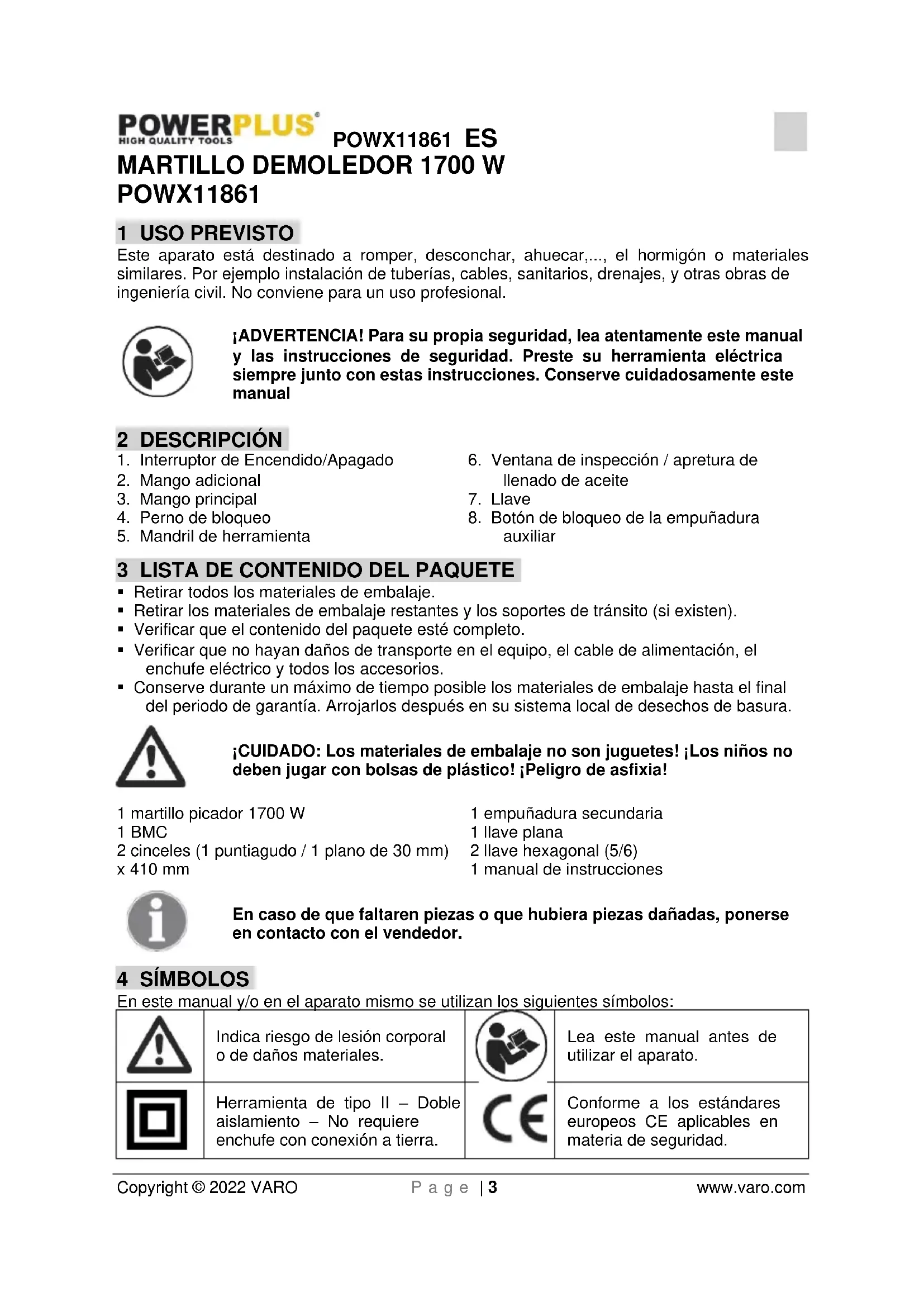 Conforme a los estándares europeos CE aplicables en materia de seguridad.POWX11861 ES Copyright © 2022 VARO P a g e | 4 www.varo.com
