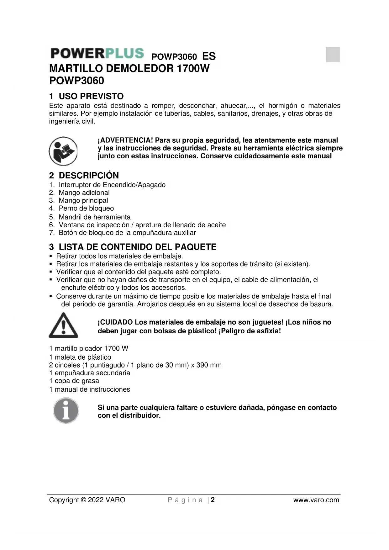 - Conserve durante un máximo de tiempo posible los materiales de embalaje hasta el final del periodo de garantía. Arrojarlos después en su sistema local de desechos de basura. ¡CUIDADO Los materiales de embalaje no son juguetes! ¡Los niños no deben jugar con bolsas de plástico! ¡Peligro de asfixia! 1 martillo picador 1700 W 1 maleta de plástico 2 cinceles (1 puntiagudo / 1 plano de 30 mm) x 390 mm 1 empuñadura secundaria 1 copa de grasa 1 manual de instrucciones Si una parte cualquiera faltare o estuviere dañada, póngase en contacto con el distribuidor.POWP3060 ES Copyright © 2022 VARO P á g i n a | 3 www.varo.com 4 SÍMBOLOS En este manual y/o en el aparato mismo se utilizan los siguientes símbolos: