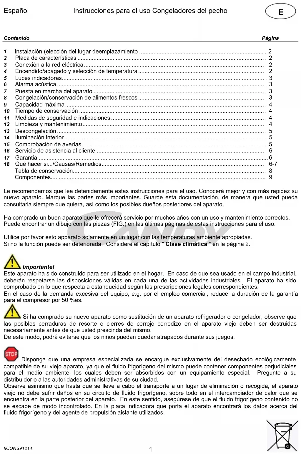 transparentes, no podrá identificarlos con claridad una vez congelados. Le recomendamos que utilice para ello las etiquetas destinadas a tal fin, que puede encontrar en el mercado. Envase los productos frescos en raciones adecuadas al consumo de su hogar, para evitar así que se descongelen grandes cantidades que no podrán consumirse en un solo día. Marque las porciones con, al menos, la siguiente información: x Nombre del producto (ej. lomo de ternera) x Peso de la porción x Cantidad (número de trozos) x Fecha de congelación x Fecha de consumo (véase Tabla de Conservación) A continuación proceda como sigue: a) Es recomendable colocar los alimentos frescos en el compartimento de pre-congelación situado en la lateral (f) (no está disponible en todos los modelos) o en el fondo del arcón. Ahí es donde se alcanza la temperatura más baja. Al introducir alimentos frescos, evite que estos entren en contacto directo con los alimentos ya congelados; ya que los productos congelados podrían descongelarse y el periodo de conservación previsto ya no sería válido. b) Llene el interior, tras las 24 horas correspondientes, sólo con la cantidad de alimentos frescos según la capacidad de congelación de su aparato. Véanse los datos en la placa de características (XX kg/24h). c) Donde esté disponible, encienda el interruptor de SUPERCONGELACIÓN (FIG.4), (no es absolutamente necesario si se introducen alimentos ya congelados, por ejemplo, artículos ultra-congelados). d) Pasadas 24 horas cambie los alimentos congelados del fondo del arcón o del compartimento de pre- congelación al cesto superior, para que así estos espacios queden disponibles para la posible congelación de otros alimentos frescos. e) Desconecte el interruptor de SUPER CONGELACIÓN (se apaga la luz amarilla). f) Lleve el regulador de temperatura a la posición adecuada según el grado de llenado del aparato (véase “Capacidad Máxima”). g) Si es posible, controle la temperatura del arcón de conservación (d) por medio de un termómetro capaz de medir la temperatura hasta –26° C. La temperatura de conservación mínima debe ser de –18ºC permanentemente. Reposición de alimentos frescos (Alimentos no congelados) Asegúrese de que la reposición de alimentos frescos, en cantidades adecuadas a la capacidad de su congelados (XX kg/24h), sólo tiene lugar una vez transcurridas al menos 24 horas desde el llenado anterior. (No sobrepase la capacidad máxima). 9 Capacidad Máxima Para garantizar una conservación inmejorable de productos congelados, no debe llenar nunca hasta arriba el arcón de conservación. Entre la puerta y el producto congelado debe existir siempre un cierto margen de distancia. Fíjese en las indicaciones de capacidad máxima del fabricante. Éstas no deben ser superadas nunca. Fije el regulador de temperatura (l) en estricta concordancia con la cantidad total de llenado. Con una temperatura ambiente normal (desde +18º hasta +22ºC), le recomendamos que para el ahorro de energía ajuste como sigue el regulador de temperatura: Cantidad de llenado Marca cantidad Ajuste Lleno Superior dirección 12:00h Medio Mitad dirección 10:00h 1/4 o menos Inferior dirección 08:00h 10 Tiempo de conservación El tiempo de conservación de los productos ultra- congelados adquiridos varía notablemente en función del tipo de producto y el envase. Siga las instrucciones que aparecen en el envase del producto correspondiente. Para congelar alimentos frescos que desee congelar, consulte la tabla de conservación al final de estas instrucciones. Una vez descongelado el producto, debe ser consumido inmediatamente, a lo sumo dentro de un plazo de 24 horas. 11 Medidas de seguridad e indicaciones x Desconecte la clavija de conexión cada vez que vaya a limpiar o descongelar. x Después de haber cerrado la puerta del arcón, no la fuerce inmediatamente para abrirla. En la junta (b) se forma un vacío que desaparece después de 1–2 minutos, pudiéndose abrir la puerta de nuevo normalmente. x Antes de tapar o guardar productos cocinados, deje enfriar el contenido del recipiente a temperatura ambiente, para así evitar la condensación del recipiente y la formación de hielo en el aparato. x Deje la puerta del congelador abierta el menor tiempo posible, para así no derrochar energía y evitar una excesiva formación de hielo dentro del aparato. x Si se enciende inesperadamente o durante un largo tiempo la luz roja, no abra el congelador y tome inmediatamente las medidas oportunas (véase “Qué hacer si...” en la parte final de estas instrucciones para el uso). x Nunca utilice un destornillador u otro tipo de herramienta metálica para quitar el hielo. Las paredes interiores son muy sensibles y no resisten bordes afilados. Utilice sólo raspadores de plástico o de madera sin bordes afilados. 12 Limpieza y mantenimiento Para la limpieza exterior de su aparato utilice de vez en cuando un abrillantador de muebles u otros detergentes para objetos laqueados (nunca lo utilice en el interior). Debe también de vez en cuando limpiar la junta (b) con agua caliente y sin utilizar detergentes. Si su aparato dispone de condensador posterior (p), límpielo de vez en cuando de pelusa y polvo. El polvo y laEspañol Instrucciones para el uso Congeladores del pecho fiCONS91214