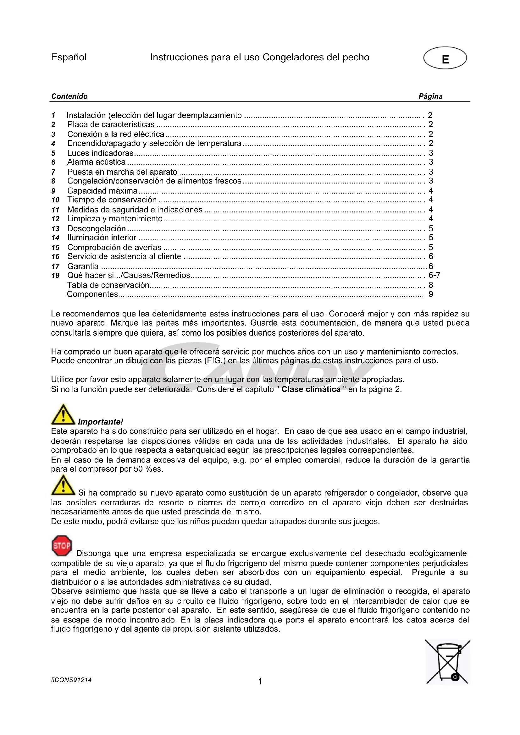 - Componentes Le recomendamos que lea detenidamente estas instrucciones para el uso. Conocerá mejor y con más rapidez su nuevo aparato. Marque las partes más importantes. Guarde esta documentación, de manera que usted pueda consultarla siempre que quiera, así como los posibles dueños posteriores del aparato. Ha comprado un buen aparato que le ofrecerá servicio por muchos años con un uso y mantenimiento correctos. Puede encontrar un dibujo con las piezas (FIG.) en las últimas páginas de estas instrucciones para el uso. Utilice por favor esto apparato solamente en un lugar con las temperaturas ambiente apropiadas. Si no la función puede ser deteriorada. Considere el capítulo " Clase climática " en la página 2. Importante! Este aparato ha sido construido para ser utilizado en el hogar. En caso de que sea usado en el campo industrial, deberán respetarse las disposiciones válidas en cada una de las actividades industriales. El aparato ha sido comprobado en lo que respecta a estanqueidad según las prescripciones legales correspondientes. En el caso de la demanda excesiva del equipo, e.g. por el empleo comercial, reduce la duración de la garantía para el compresor por 50 %es. Si ha comprado su nuevo aparato como sustitución de un aparato refrigerador o congelador, observe que las posibles cerraduras de resorte o cierres de cerrojo corredizo en el aparato viejo deben ser destruidas necesariamente antes de que usted prescinda del mismo. De este modo, podrá evitarse que los niños puedan quedar atrapados durante sus juegos. Disponga que una empresa especializada se encargue exclusivamente del desechado ecológicamente compatible de su viejo aparato, ya que el fluido frigorígeno del mismo puede contener componentes perjudiciales para el medio ambiente, los cuales deben ser absorbidos con un equipamiento especial. Pregunte a su distribuidor o a las autoridades administrativas de su ciudad. Observe asimismo que hasta que se lleve a cabo el transporte a un lugar de eliminación o recogida, el aparato viejo no debe sufrir daños en su circuito de fluido frigorígeno, sobre todo en el intercambiador de calor que se encuentra en la parte posterior del aparato. En este sentido, asegúrese de que el fluido frigorígeno contenido no se escape de modo incontrolado. En la placa indicadora que porta el aparato encontrará los datos acerca del fluido frigorígeno y del agente de propulsión aislante utilizados.Español Instrucciones para el uso Congeladores del pecho fiCONS91214 p. 9