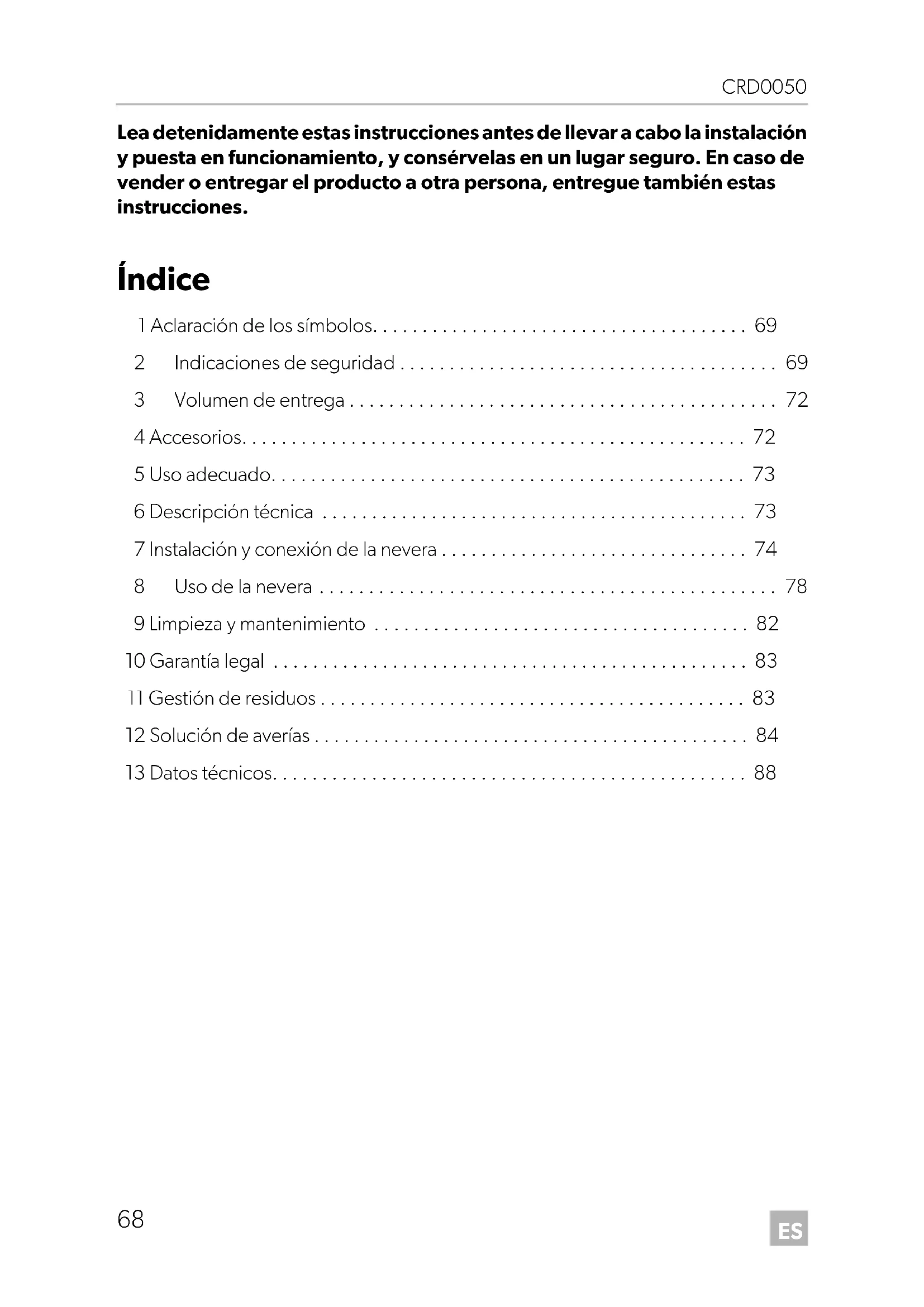 - Lea detenidamente estas instrucciones antes de llevar a cabo la instalación y puesta en funcionamiento, y consérvelas en un lugar seguro. En caso de vender o entregar el producto a otra persona, entregue también estas instrucciones. Índice 1 Aclaración de los símbolos p. 69