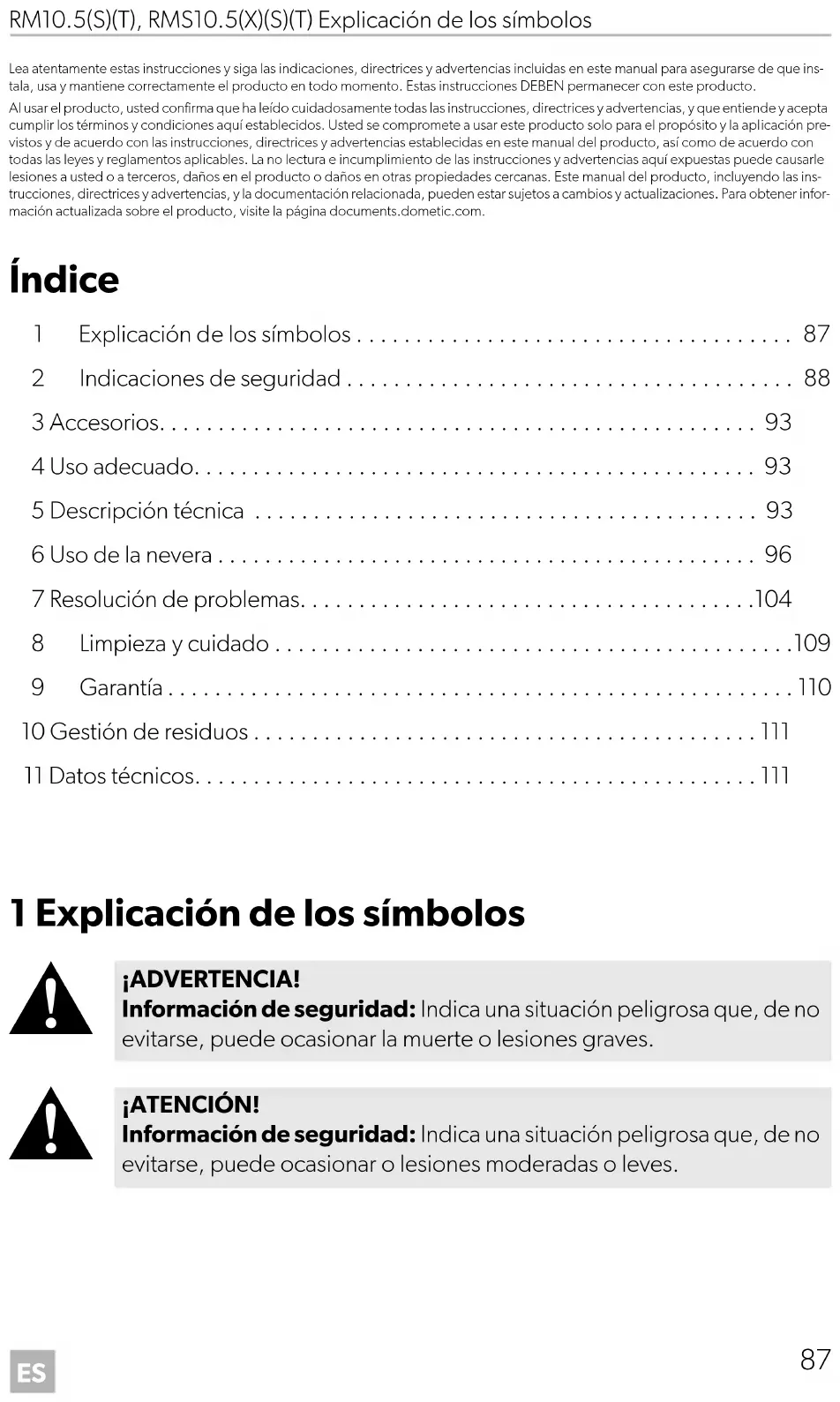 - Lea atentamente estas instrucciones y siga las indicaciones, directrices y advertencias incluidas en este manual para asegurarse de que ins- tala, usa y mantiene correctamente el producto en todo momento. Estas instrucciones DEBEN permanecer con este producto. Al usar el producto, usted confirma que ha leído cuidadosamente todas las instrucciones, directrices y advertencias, y que entiende y acepta cumplir los términos y condiciones aquí establecidos. Usted se compromete a usar este producto solo para el propósito y la aplicación pre- vistos y de acuerdo con las instrucciones, directrices y advertencias establecidas en este manual del producto, así como de acuerdo con todas las leyes y reglamentos aplicables. La no lectura e incumplimiento de las instrucciones y advertencias aquí expuestas puede causarle lesiones a usted o a terceros, daños en el producto o daños en otras propiedades cercanas. Este manual del producto, incluyendo las ins- trucciones, directrices y advertencias, y la documentación relacionada, pueden estar sujetos a cambios y actualizaciones. Para obtener infor- mación actualizada sobre el producto, visite la página documents.dometic.com. Índice 1 Explicación de los símbolos p. 87
