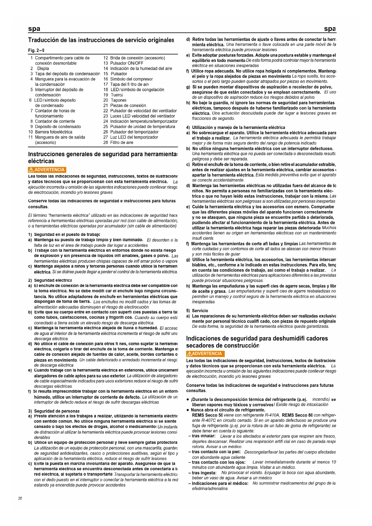 Nunca abra el circuito de refrigerante. REMS Secco 50 viene con refrigerante R-410A, REMS Secco 80 con refriger- ante R-407C en circuito cerrado. Si en un aparato defectuoso se produce una fuga de refrigerante (p.ej. por la rotura de un tubo de goma de refrigerante) se debe tener en cuenta lo siguiente: – tras inhalar: Llevar a los afectados al exterior para que respiren aire fresco, dejarles descansar. Realizar una respiración artifi cial en caso de parada respi- ratoria. Avisar a un médico. – tras contacto con la piel: Descongelar/lavar las partes del cuerpo afectadas con abundante agua caliente. – tras contacto con los ojos: Lavar inmediatamente durante al menos 10 minutos con abundante agua limpia. Visitar a un médico. – tras ingesta: No provocar el vómito. Enjuagar la boca con agua abundante, beber un vaso de agua. Avisar a un médico. – Indicaciones para el médico: No suministrar medicamentos del grupo de la efedrina/adrenalina. Fig. 2 – 9 1 Compartimento para cable de conexión desmontable 2 Display 3 Tapa del depósito de condensación 4 Manguera para la evacuación de la condensación 5 Interruptor del depósito de condensación 6 LED / símbolo depósito de condensado 7 Contador de horas de funcionamiento 8 Contador de corriente 9 Depósito de condensado 10 Barrera fotoeléctrica 11 Manguera de aire de salida (accesorio) 12 Brida de conexión (accesorio) 13 Pulsador ON/OFF 14 Indicación de la humedad del aire 15 Pulsador 16 Símbolo del compresor 17 Tapa del fi ltro de aire 18 LED / símbolo de congelación 19 Tuerca 20 Tapones 21 Piezas de conexión 22 Pulsador de velocidad del ventilador 23 Luces LED velocidad del ventilador 24 Indicación temperatura/temporizador 25 Pulsador de unidad de temperatura 26 Pulsador del temporizador 27 Luz LED del temporizador 28 Filtro de aire 28REMS Secco 50
