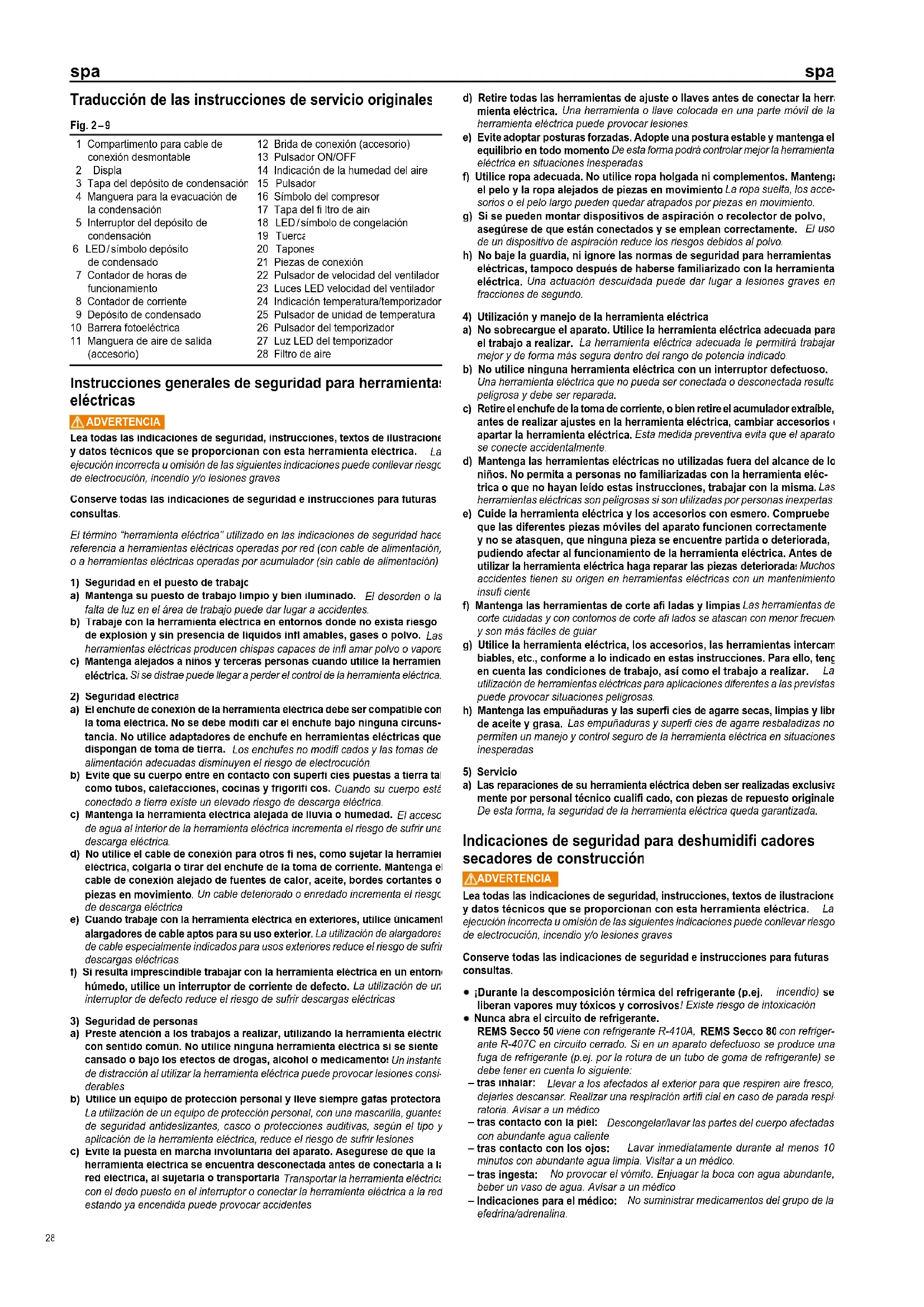 a) Las reparaciones de su herramienta eléctrica deben ser realizadas exclusiva- mente por personal técnico cualifi cado, con piezas de repuesto originales. De esta forma, la seguridad de la herramienta eléctrica queda garantizada. Indicaciones de seguridad para deshumidifi cadores/ secadores de construcción ADVERTENCIA ADVERTENCIA Lea todas las indicaciones de seguridad, instrucciones, textos de ilustraciones y datos técnicos que se proporcionan con esta herramienta eléctrica.