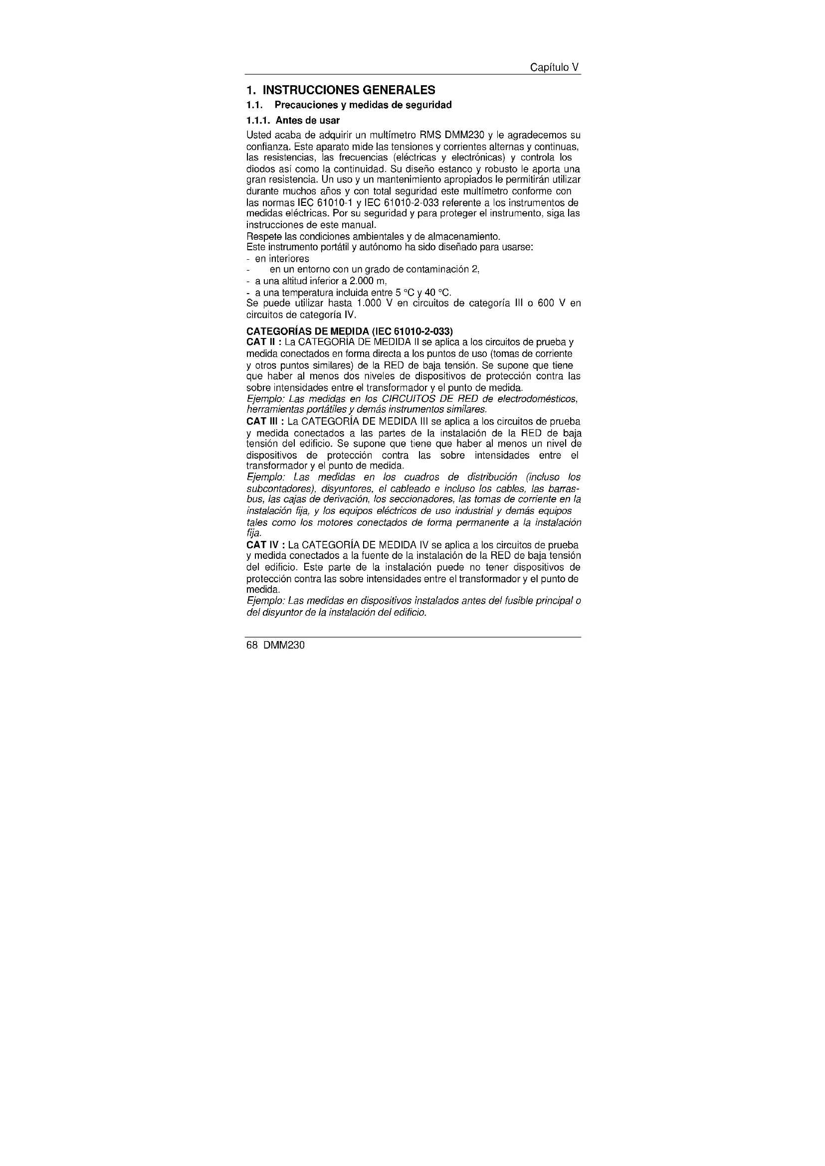 Usted acaba de adquirir un multímetro RMS DMM230 y le agradecemos su confianza. Este aparato mide las tensiones y corrientes alternas y continuas, las resistencias, las frecuencias (eléctricas y electrónicas) y controla los diodos así como la continuidad. Su diseño estanco y robusto le aporta una gran resistencia. Un uso y un mantenimiento apropiados le permitirán utilizar durante muchos años y con total seguridad este multímetro conforme con las normas IEC 61010-1 y IEC 61010-2-033 referente a los instrumentos de medidas eléctricas. Por su seguridad y para proteger el instrumento, siga las instrucciones de este manual. Respete las condiciones ambientales y de almacenamiento. Este instrumento portátil y autónomo ha sido diseñado para usarse: - en interiores - en un entorno con un grado de contaminación 2, - a una altitud inferior a 2.000 m, - a una temperatura incluida entre 5 °C y 40 °C. Se puede utilizar hasta 1.000 V en circuitos de categoría III o 600 V en circuitos de categoría IV. CATEGORÍAS DE MEDIDA (IEC 61010-2-033) CAT II : La CATEGORÍA DE MEDIDA II se aplica a los circuitos de prueba y medida conectados en forma directa a los puntos de uso (tomas de corriente y otros puntos similares) de la RED de baja tensión. Se supone que tiene que haber al menos dos niveles de dispositivos de protección contra las sobre intensidades entre el transformador y el punto de medida. Ejemplo: Las medidas en los CIRCUITOS DE RED de electrodomésticos, herramientas portátiles y demás instrumentos similares. CAT III : La CATEGORÍA DE MEDIDA III se aplica a los circuitos de prueba y medida conectados a las partes de la instalación de la RED de baja tensión del edificio. Se supone que tiene que haber al menos un nivel de dispositivos de protección contra las sobre intensidades entre el transformador y el punto de medida. Ejemplo: Las medidas en los cuadros de distribución (incluso los subcontadores), disyuntores, el cableado e incluso los cables, las barras- bus, las cajas de derivación, los seccionadores, las tomas de corriente en la instalación fija, y los equipos eléctricos de uso industrial y demás equipos tales como los motores conectados de forma permanente a la instalación fija. CAT IV : La CATEGORÍA DE MEDIDA IV se aplica a los circuitos de prueba y medida conectados a la fuente de la instalación de la RED de baja tensión del edificio. Este parte de la instalación puede no tener dispositivos de protección contra las sobre intensidades entre el transformador y el punto de medida. Ejemplo: Las medidas en dispositivos instalados antes del fusible principal o del disyuntor de la instalación del edificio.Capítulo V DMM230 69