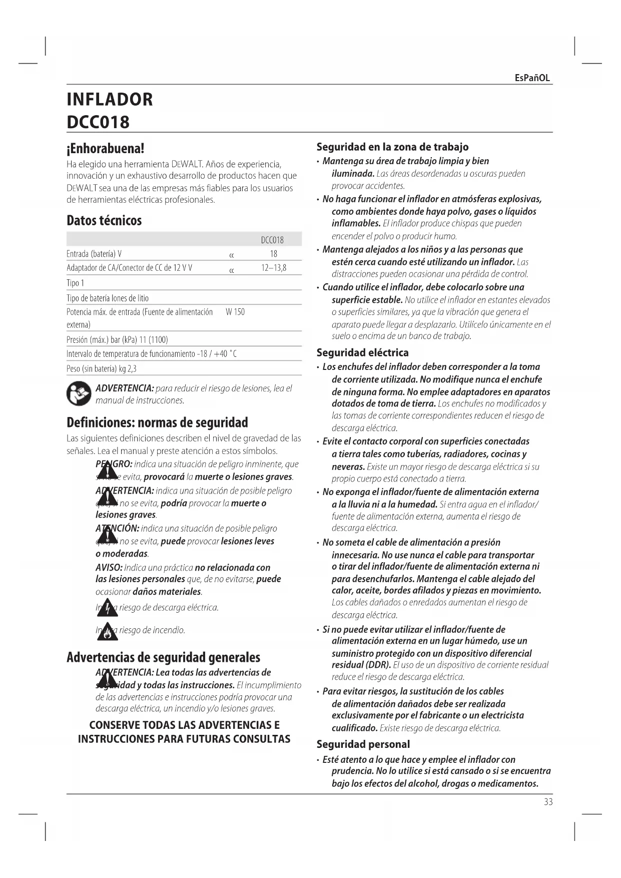 - Esté atento a lo que hace y emplee el inflador con prudencia. No lo utilice si está cansado o si se encuentra bajo los efectos del alcohol, drogas o medicamentos. ¡Enhorabuena! Ha elegido una herramienta DeWALT . Años de experiencia, innovación y un exhaustivo desarrollo de productos hacen que DeWALT sea una de las empresas más fiables para los usuarios de herramientas eléctricasprofesionales. Datos técnicos DCC018 Entrada (batería) V