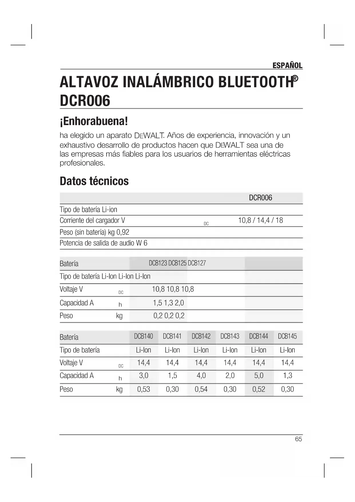 WALT sea una de las empresas más fiables para los usuarios de herramientas eléctricas profesionales. Datos técnicos DCR006 Tipo de batería Li-ion Corriente del cargador V