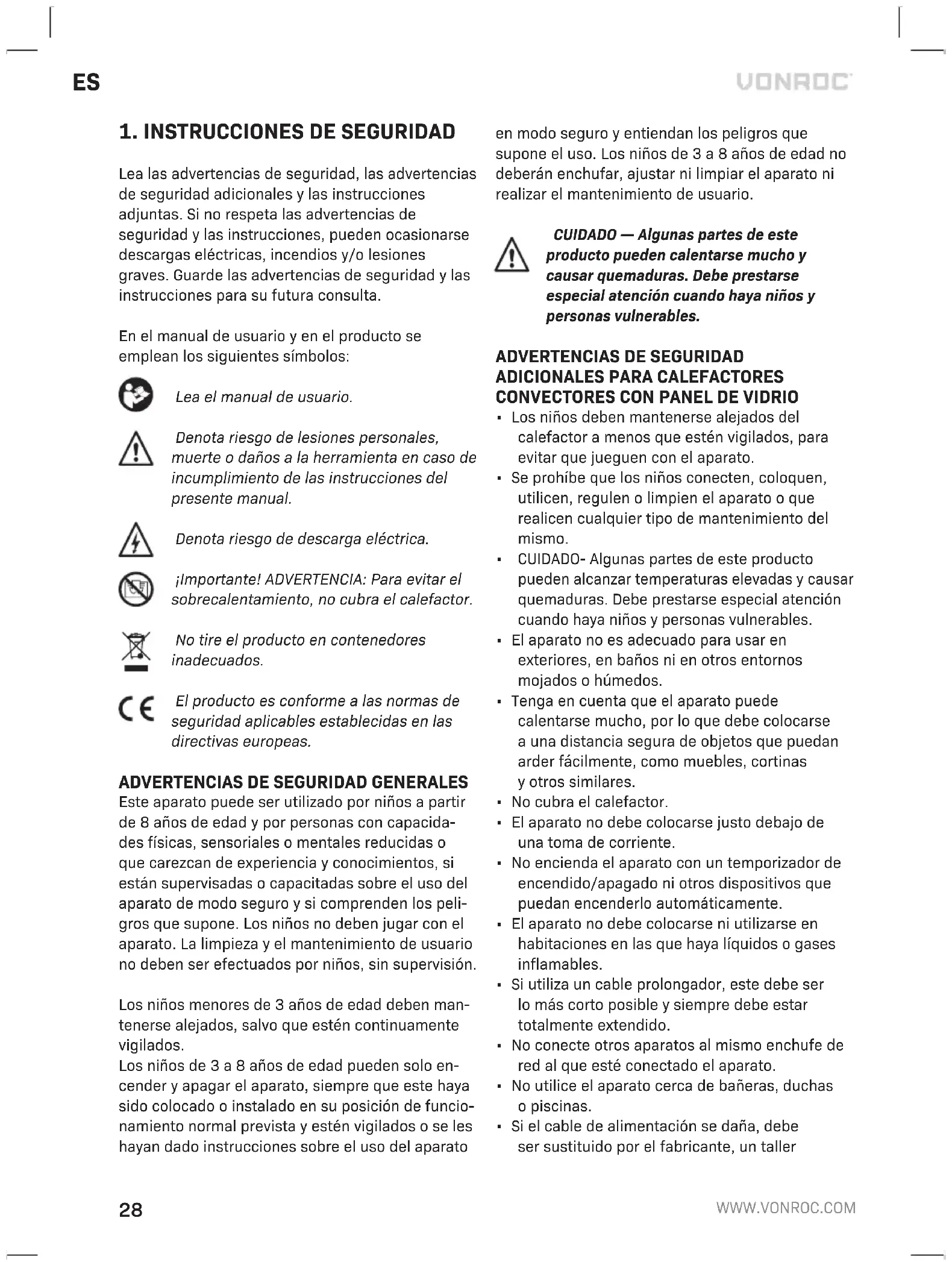 Lea las advertencias de seguridad, las advertencias de seguridad adicionales ylas instrucciones adjuntas. Si no respeta las advertencias de seguridad ylas instrucciones, pueden ocasionarse descargas eléctricas, incendios y/olesiones graves. Guarde las advertencias de seguridad ylas instrucciones para su futura consulta. En el manual de usuario yen el producto se emplean los siguientes símbolos: Lea el manual de usuario. Denota riesgo de lesiones personales, muerte odaños ala herramienta en caso de incumplimiento de las instrucciones del presente manual. Denota riesgo de descarga eléctrica. ¡Importante! ADVERTENCIA: Para evitar el sobrecalentamiento, no cubra el calefactor. No tire el producto en contenedores inadecuados. El producto es conforme alas normas de seguridad aplicables establecidas en las directivas europeas.