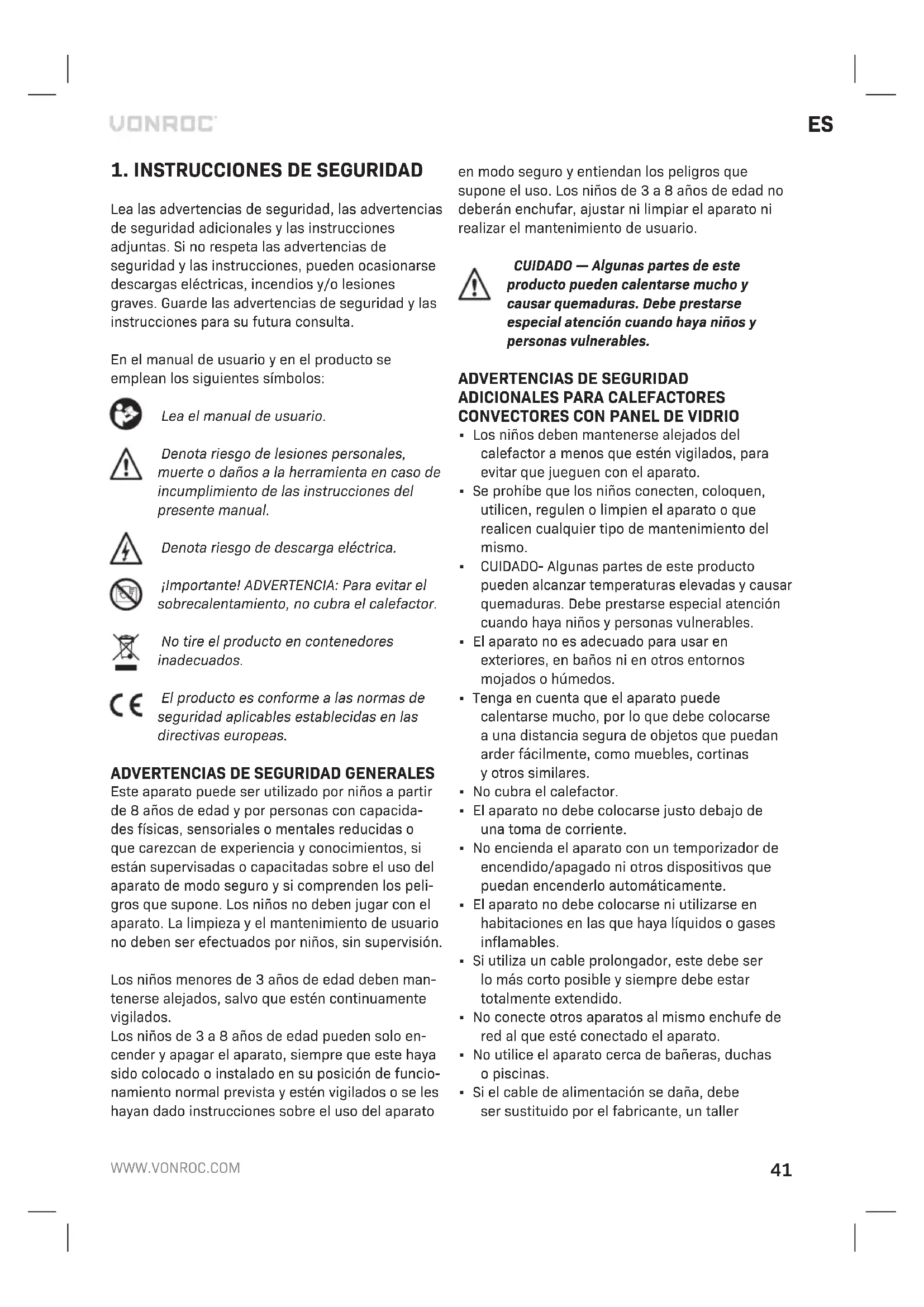 Lea las advertencias de seguridad, las advertencias de seguridad adicionales ylas instrucciones adjuntas. Si no respeta las advertencias de seguridad ylas instrucciones, pueden ocasionarse descargas eléctricas, incendios y/olesiones graves. Guarde las advertencias de seguridad ylas instrucciones para su futura consulta. En el manual de usuario yen el producto se emplean los siguientes símbolos: Lea el manual de usuario. Denota riesgo de lesiones personales, muerte odaños ala herramienta en caso de incumplimiento de las instrucciones del presente manual. Denota riesgo de descarga eléctrica. ¡Importante! ADVERTENCIA: Para evitar el sobrecalentamiento, no cubra el calefactor. No tire el producto en contenedores inadecuados. El producto es conforme alas normas de seguridad aplicables establecidas en las directivas europeas.