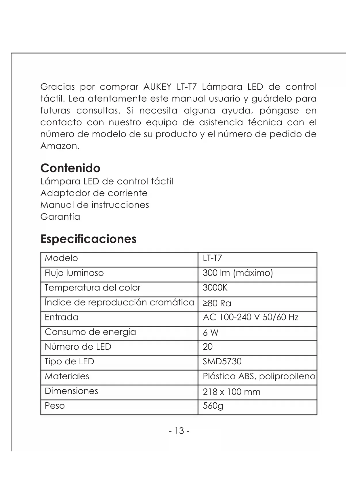- Veuillez noter qu’AUKEY ne peut fournir un service après vente que pour les produits achetés directement via AUKEY.. Si vous avez acheté votre produit AUKEY via un vendeur différent, veuillez contacter directement ce vendeur pour les questions de maintenance et de garantie.Gracias por comprar AUKEY LT-T7 Lámpara LED de control táctil. Lea atentamente este manual usuario y guárdelo para futuras consultas. Si necesita alguna ayuda, póngase en contacto con nuestro equipo de asistencia técnica con el número de modelo de su producto y el número de pedido de Amazon. Contenido Lámpara LED de control táctil Adaptador de corriente Manual de instrucciones Garantía Especificaciones Modelo Flujo luminoso Temperatura del color Índice de reproducción cromática Entrada Consumo de energía Número de LED Tipo de LED Materiales Dimensiones Peso LT-T7 300 lm (máximo) 3000K ≥80 Ra AC 100-240 V 50/60 Hz