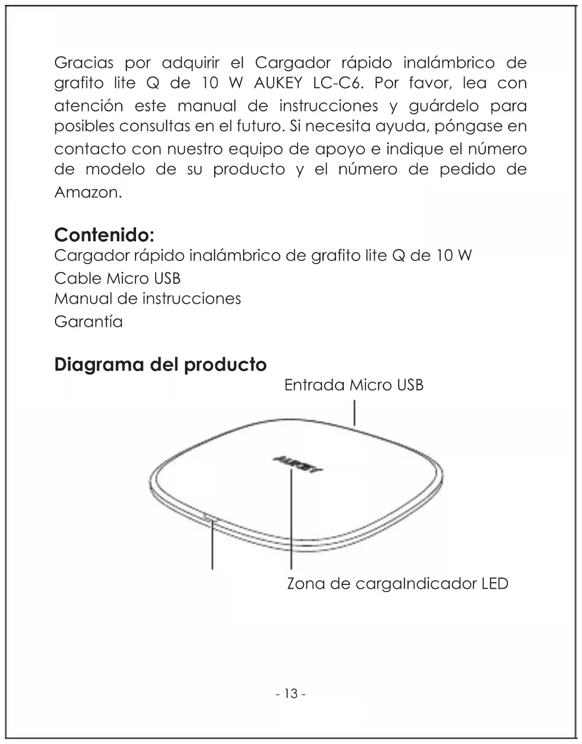 Gracias por adquirir el Cargador rápido inalámbrico de grafito lite Q de 10 W AUKEY LC-C6. Por favor, lea con atencion este manual de instructuciones y guardelo para posibles consultas en el futuro. Si necesita ayud, póngase en contacto con nuestro equipo de apoyo e indique el número de modelo de su producto y el número de pedido de Amazon.