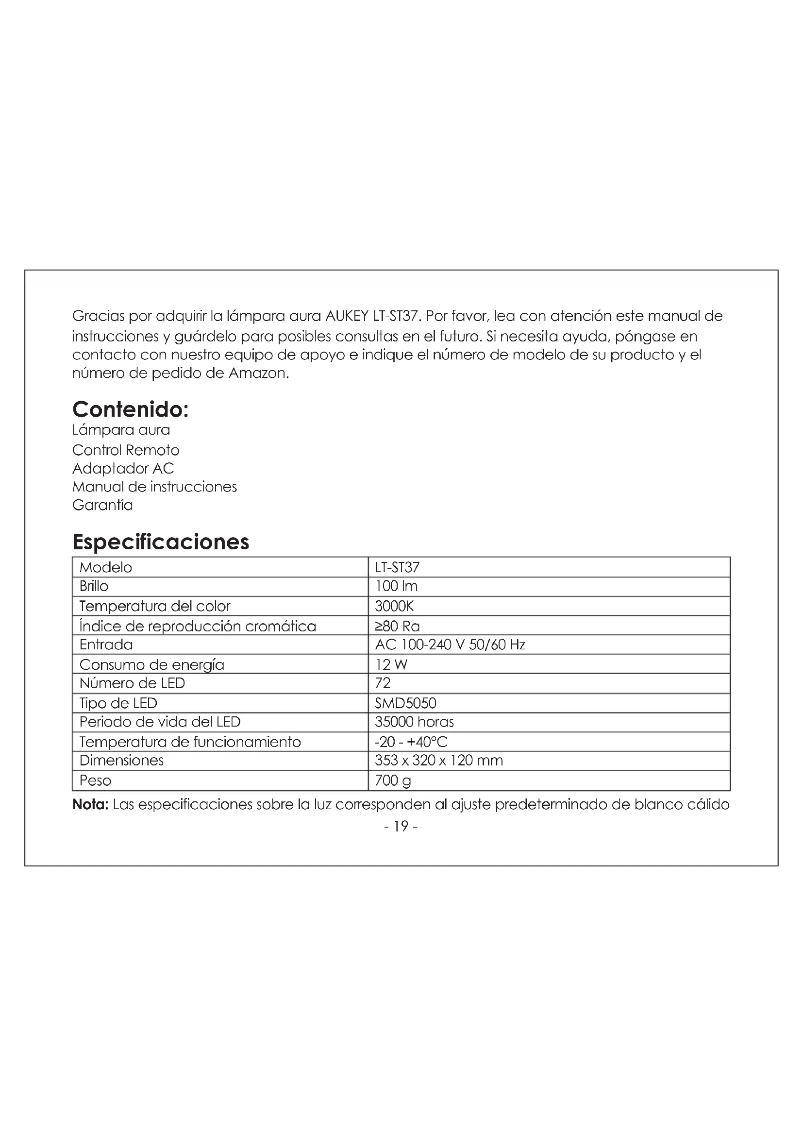 - Veuillez noter qu’AUKEY ne peut fournir un service après-vente que pour les produits achetés directement via AUKEY. Si vous avez acheté votre produit AUKEY via un vendeur différent, veuillez contacter directement ce vendeur pour les questions de maintenance et de garantie.- 19 - Gracias por adquirir la lámpara aura AUKEY LT-ST37. Por favor, lea con atención este manual de instrucciones y guárdelo para posibles consultas en el futuro. Si necesita ayuda, póngase en contacto con nuestro equipo de apoyo e indique el número de modelo de su producto y el número de pedido de Amazon. Contenido: Lámpara aura Control Remoto Adaptador AC Manual de instrucciones Garantía Especificaciones Modelo Brillo Temperatura del color Índice de reproducción cromática Entrada Consumo de energía Número de LED Tipo de LED Periodo de vida del LED Temperatura de funcionamiento Dimensiones Peso LT-ST37 100 lm 3000K ≥80 Ra AC 100-240 V 50/60 Hz 12 W