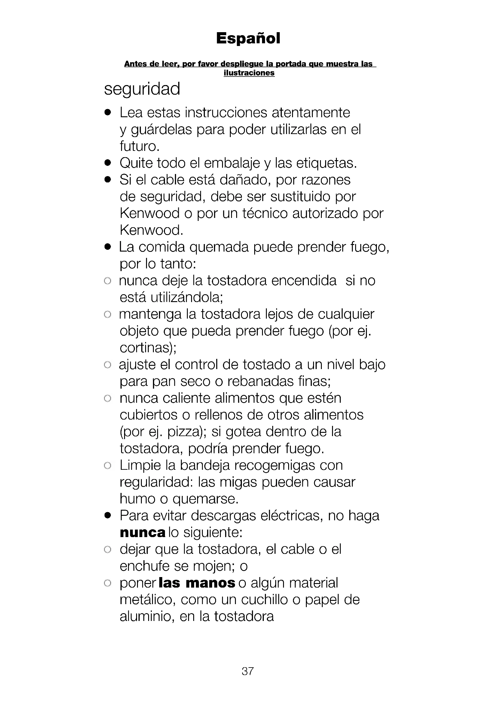 poner las manos o algún material metálico, como un cuchillo o papel de aluminio, en la tostadora Antes de leer, por favor despliegue la portada que muestra las ilustracionesEnglish