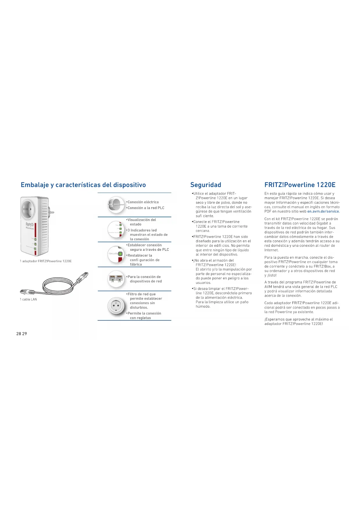 - Permite la conexión con regletas 1 adaptador FRITZ!Powerline1220E 1 cable LAN FRITZ!Powerline 1220E En esta guía rápida se indica cómo usar y manejar FRITZ!Powerline 1220E. Si desea mayor Información y especifi caciones técni- cas, consulte el manual en inglés en formato PDF en nuestro sitio web en.avm.de/service. Con el kit FRITZ!Powerline1220E se podrán transmitir datos con velocidad Gigabit a través de la red eléctrica de su hogar. Sus dispositivos de red podrán también inter- cambiar datos cómodamente a través de esta conexión y además tendrán acceso a su red doméstica y una conexión al router de Internet. Para la puesta en marcha, conecte el dis- positivo FRITZ!Powerline en cualquier toma de corriente y conéctelo a su FRITZ!Box, a su ordenador y a otros dispositivos de red y ¡listo! A través del programa FRITZ!Powerline de AVM tendrá una vista general de la red PLC y podrá visualizar información detallada acerca de la conexión. Cada adaptador FRITZ!Powerline 1220E adi- cional podrá ser conectado en pocos pasos a la red Powerline ya existente. ¡Esperamos que aproveche al máximo el adaptador FRITZ!Powerline 1220E! 28 29Cable unifase (L) Cable neutro (N) Polo a tierra (PE) Par adicional Par estándar