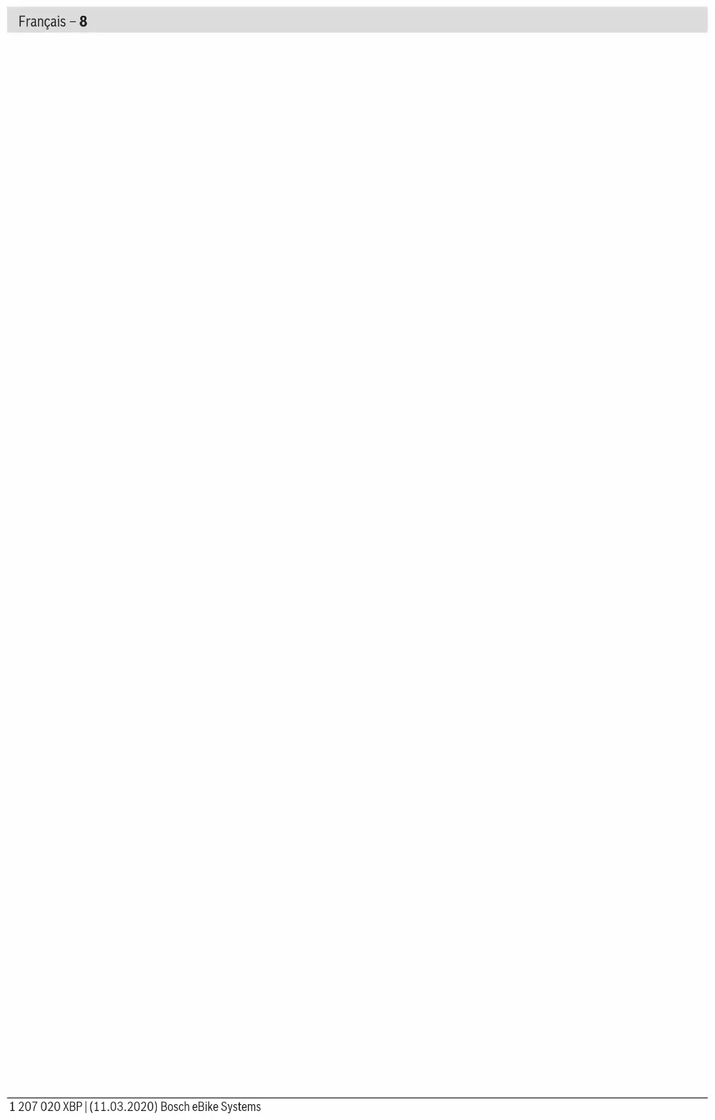 A) El sistema eBike debe estar desconectado. B) La información aparece en forma de rótulo en movimiento. C) La pantalla debe estar desconectada. 1 207 020 XBP | (11.03.2020) Bosch eBike SystemsEspañol – 5 Indicador de código de fallos Los componentes del sistema de la eBike se comprueban constantemente de forma automática. Si se determina un error, se muestra el correspondiente código de error en el ordenador de a bordo. Dependiente del tipo de fallo, el accionamiento se puede desconectar automáticamente. La continuación del viaje sin asistencia por el accionamiento es posible en cualquier mo- mento. Antes de emprender otros recorridos, la eBike debe ser revisada. u Encargue todas las reparaciones únicamente a un dis- tribuidor de bicicletas autorizado. Código Causa Remedio 410 Se han bloqueado una o más teclas del or- denador de a bordo. Compruebe si hay teclas atascadas, p.ej. a causa de la penetra- ción de suciedad. En caso necesario, limpie las teclas. 414 Problema de conexión de la unidad de mando Encargue la revisión de las conexiones y uniones 418 Se han bloqueado una o más teclas del or- denador de a bordo. Compruebe si hay teclas atascadas, p.ej. a causa de la penetra- ción de suciedad. En caso necesario, limpie las teclas. 419 Fallo de configuración Reinicie el sistema. Si el problema persiste, contacte con su distri- buidor de eBike Bosch. 422 Problema de conexión de la unidad motriz Encargue la revisión de las conexiones y uniones 423 Problema de conexión del acumulador de la eBike Encargue la revisión de las conexiones y uniones 424 Error de comunicación entre los compo- nentes Encargue la revisión de las conexiones y uniones 426 Fallo interno de superación de tiempo Reinicie el sistema. Si el problema persiste, contacte con su distri- buidor de eBike Bosch. En este estado de error, no es posible vi- sualizar o ajustar el perímetro del neumático en el menú de confi- guración básica. 430 La batería interna del ordenador de a bor- do está descargada (no con BUI350) Cargar el ordenador de a bordo (en el soporte o mediante puerto USB) 431 Error de versión del software Reinicie el sistema. Si el problema persiste, contacte con su distri- buidor de eBike Bosch. 440 Fallo interno de la unidad motriz Reinicie el sistema. Si el problema persiste, contacte con su distri- buidor de eBike Bosch. 450 Error interno de software Reinicie el sistema. Si el problema persiste, contacte con su distri- buidor de eBike Bosch. 460 Error en el puerto USB Retire el cable del puerto USB del ordenador de a bordo. Si el pro- blema persiste, contacte con su distribuidor de eBike Bosch. 490 Error interno del ordenador de a bordo Encargue la revisión del ordenador de a bordo 500 Fallo interno de la unidad motriz Reinicie el sistema. Si el problema persiste, contacte con su distri- buidor de eBike Bosch. 502 Fallo en la iluminación de la bicicleta Compruebe la luz y el cableado correspondiente. Reinicie el siste- ma. Si el problema persiste, contacte con su distribuidor de eBike Bosch. 503 Fallo en el sensor de velocidad Reinicie el sistema. Si el problema persiste, contacte con su distri- buidor de eBike Bosch. 504 Se ha detectado una manipulación de la señal de velocidad. Comprobar y, dado el caso, ajustar la posición del imán de memo- ria. Comprobar si existe manipulación (tuneo). La asistencia del motor disminuye. 510 Fallo interno del sensor Reinicie el sistema. Si el problema persiste, contacte con su distri- buidor de eBike Bosch. 511 Fallo interno de la unidad motriz Reinicie el sistema. Si el problema persiste, contacte con su distri- buidor de eBike Bosch. Bosch eBike Systems 1 207 020 XBP | (11.03.2020)Español – 6 Código Causa Remedio 530 Fallo del acumulador Desconecte la eBike, extraiga el acumulador de la misma y vuelva a colocarlo. Reinicie el sistema. Si el problema persiste, contacte con su distribuidor de eBike Bosch. 531 Fallo de configuración Reinicie el sistema. Si el problema persiste, contacte con su distri- buidor de eBike Bosch. 540 Fallo de temperatura La eBike se encuentra fuera del rango de temperatura permitido. Desconecte el sistema eBike para que la unidad motriz se enfríe o se caliente hasta alcanzare el rango de temperatura permitido. Rei- nicie el sistema. Si el problema persiste, contacte con su distribui- dor de eBike Bosch. 550 Se ha detectado un consumidor no autori- zado. Elimine el consumidor. Reinicie el sistema. Si el problema persiste, contacte con su distribuidor de eBike Bosch. 580 Error de versión del software Reinicie el sistema. Si el problema persiste, contacte con su distri- buidor de eBike Bosch. 591 Error de autentificación Desconecte el sistema eBike. Extraiga el acumulador y vuelva a ins- talarlo. Reinicie el sistema. Si el problema persiste, contacte con su distribuidor de eBike Bosch. 592 Componentes incompatibles Utilizar una pantalla compatible. Si el problema persiste, contacte con su distribuidor de eBike Bosch. 593 Fallo de configuración Reinicie el sistema. Si el problema persiste, contacte con su distri- buidor de eBike Bosch. 595, 596 Error de comunicación Compruebe el cableado hasta la caja de cambios y reinicie el siste- ma. Si el problema persiste, contacte con su distribuidor de eBike Bosch. 602 Fallo interno del acumulador Reinicie el sistema. Si el problema persiste, contacte con su distri- buidor de eBike Bosch. 603 Fallo interno del acumulador Reinicie el sistema. Si el problema persiste, contacte con su distri- buidor de eBike Bosch. 605 Fallo de temperatura del acumulador El acumulador se encuentra fuera del rango de temperatura permi- tido. Desconecte el sistema eBike para que el acumulador se enfríe o se caliente hasta alcanzar el rango de temperatura permitido. Reinicie el sistema. Si el problema persiste, contacte con su distri- buidor de eBike Bosch. 606 Fallo externo del acumulador Compruebe el cableado. Reinicie el sistema. Si el problema persis- te, contacte con su distribui