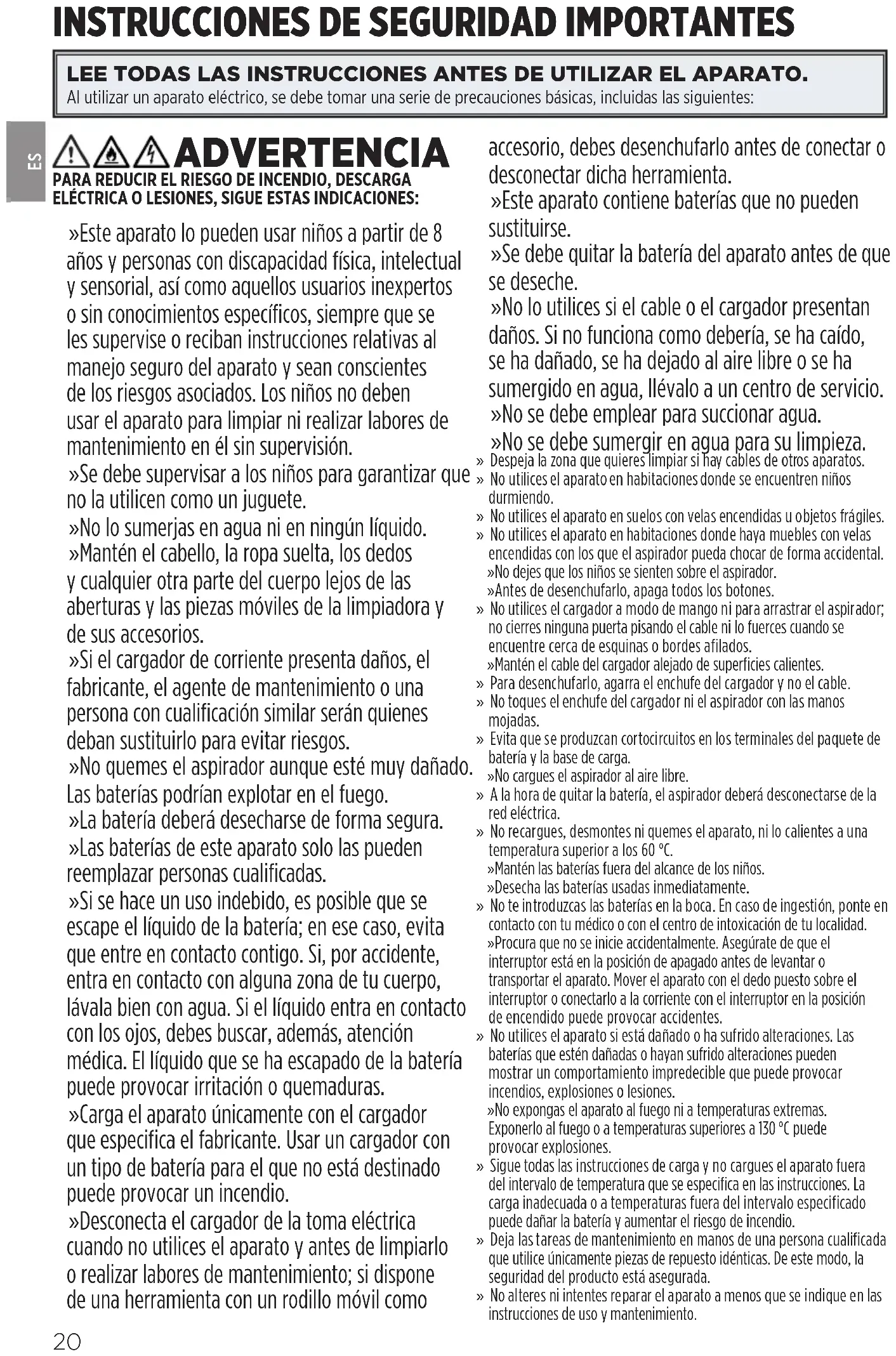 ADVERTENCIA PARA REDUCIR EL RIESGO DE INCENDIO, DESCARGA ELÉCTRICA O LESIONES, SIGUE ESTAS INDICACIONES: » Este aparato lo pueden usar niños a partir de 8 años y personas con discapacidad física, intelectual y sensorial, así como aquellos usuarios inexpertos o sin conocimientos específicos, siempre que se les supervise o reciban instrucciones relativas al manejo seguro del aparato y sean conscientes de los riesgos asociados. Los niños no deben usar el aparato para limpiar ni realizar labores de mantenimiento en él sin supervisión. » Se debe supervisar a los niños para garantizar que no la utilicen como un juguete. » No lo sumerjas en agua ni en ningún líquido. » Mantén el cabello, la ropa suelta, los dedos y cualquier otra parte del cuerpo lejos de las aberturas y las piezas móviles de la limpiadora y de sus accesorios. » Si el cargador de corriente presenta daños, el fabricante, el agente de mantenimiento o una persona con cualificación similar serán quienes deban sustituirlo para evitar riesgos. » No quemes el aspirador aunque esté muy dañado. Las baterías podrían explotar en el fuego. » La batería deberá desecharse de forma segura. » Las baterías de este aparato solo las pueden reemplazar personas cualificadas. » Si se hace un uso indebido, es posible que se escape el líquido de la batería; en ese caso, evita que entre en contacto contigo. Si, por accidente, entra en contacto con alguna zona de tu cuerpo, lávala bien con agua. Si el líquido entra en contacto con los ojos, debes buscar, además, atención médica. El líquido que se ha escapado de la batería puede provocar irritación o quemaduras. » Carga el aparato únicamente con el cargador queespecifica el fabricante. Usar un cargador con un tipo de batería para el que no está destinado puede provocar un incendio. » Desconecta el cargador de la toma eléctrica cuando no utilices el aparato y antes de limpiarlo o realizar labores de mantenimiento; si dispone de una herramienta con un rodillo móvil como accesorio, debes desenchufarlo antes de conectar o desconectar dicha herramienta. » Este aparato contiene baterías que no pueden sustituirse. » Se debe quitar la batería del aparato antes deque se deseche. » No lo utilices si el cable o el cargador presentan daños. Si no funciona como debería, se ha caído, se ha dañado, seha dejado al aire libre o se ha sumergido enagua, llévalo a un centro de servicio. » No se debe emplear para succionar agua. » No se debe sumergir en agua para su limpieza. » Despeja la zona que quieres limpiar si hay cables de otros aparatos. » No utilices el aparato en habitaciones donde seencuentren niños durmiendo. » No utilices el aparato en suelos con velas encendidas u objetos frágiles. » No utilices el aparato en habitaciones donde hayamuebles con velas encendidas con los que el aspirador pueda chocar de forma accidental. » No dejes que los niños se sienten sobre el aspirador. » Antes de desenchufarlo, apaga todos los botones. » No utilices el cargador a modo de mango ni para arrastrar el aspirador; no cierres ninguna puerta pisando el cable ni lo fuerces cuando se encuentre cerca de esquinas o bordes afilados. » Mantén el cable del cargador alejado de superficies calientes. » Para desenchufarlo, agarra el enchufe del cargador y no el cable. » No toques el enchufe del cargador ni el aspirador con las manos mojadas. » Evita que se produzcan cortocircuitos en los terminales del paquete de batería y la base de carga. » No cargues el aspirador al aire libre. » A la hora de quitar la batería, el aspirador deberá desconectarse de la red eléctrica. » No recargues, desmontes ni quemes el aparato, ni lo calientes a una temperatura superior a los 60°C. » Mantén las baterías fuera del alcance de los niños. » Desecha las baterías usadas inmediatamente. » No te introduzcas las baterías en la boca. En caso de ingestión, ponte en contacto con tu médico ocon el centro de intoxicación de tu localidad. » Procura que no se inicie accidentalmente. Asegúrate de que el interruptor está en la posición de apagado antes de levantar o transportar el aparato. Mover el aparato con el dedo puesto sobre el interruptor o conectarlo a la corriente con el interruptor en la posición de encendido puede provocar accidentes. » No utilices el aparato si está dañado o ha sufrido alteraciones. Las baterías que estén dañadas ohayan sufrido alteraciones pueden mostrar un comportamiento impredecible que puede provocar incendios, explosiones o lesiones. » No expongas el aparato al fuego ni a temperaturas extremas. Exponerlo al fuego o a temperaturas superiores a 130°C puede provocar explosiones. » Sigue todas las instrucciones de carga y no cargues el aparato fuera del intervalo de temperatura que se especifica en las instrucciones. La carga inadecuada o a temperaturas fuera del intervalo especificado puede dañar la batería yaumentar el riesgo de incendio. » Deja las tareas de mantenimiento en manos de una persona cualificada que utilice únicamente piezas de repuesto idénticas. Deeste modo, la seguridad del producto está asegurada. » No alteres ni intentes reparar el aparato a menos que se indique en las instrucciones de uso ymantenimiento. LEE TODAS LAS INSTRUCCIONES ANTES DE UTILIZAR EL APARATO. Al utilizar un aparato eléctrico, se debe tomar una serie de precauciones básicas, incluidas las siguientes:
