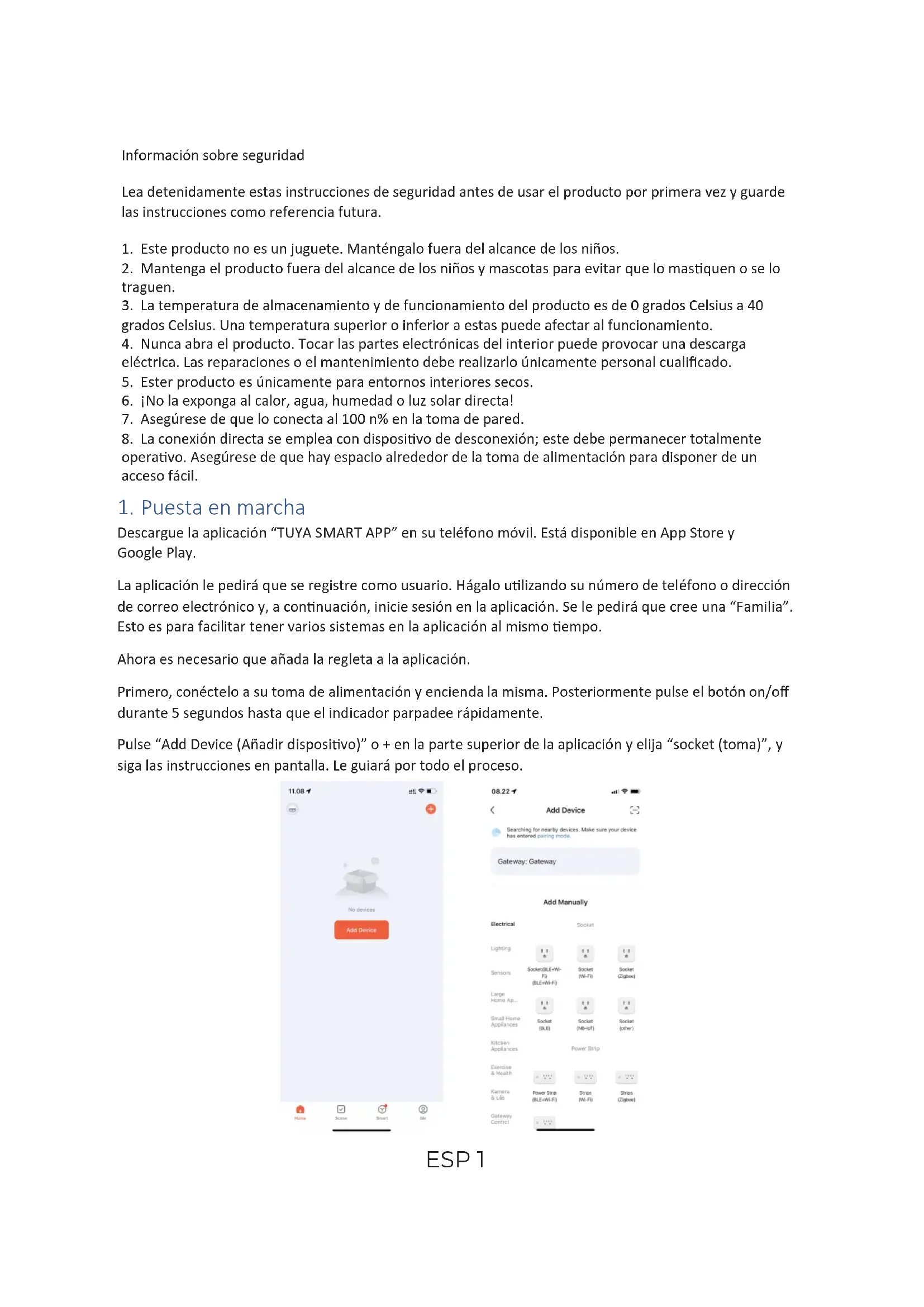 Descargue la aplicación “TUYASMARTAPP” en su teléfono móvil. Está disponible en App Store y Google Play. La aplicación le pedirá que se registre como usuario. Hágalo ulizando su número de teléfono o dirección de correo electrónico y, a connuación, inicie sesión en la aplicación. Se le pedirá que cree una “Familia”. Esto es para facilitar tener varios sistemas en la aplicación al mismo empo. Ahora es necesario que añada la regleta a la aplicación. Primero, conéctelo a su toma de alimentación y encienda la misma. Posteriormente pulse el botón on/off durante 5 segundos hasta que el indicador parpadee rápidamente. Pulse “Add Device (Añadir disposivo)” o + en la parte superior de la aplicación y elija “socket (toma)”, y siga las instrucciones en pantalla. Le guiará por todo el proceso. ESP 12. Uso diario En la pantalla domésca de la aplicación puede ahora encontrar la regleta. Pulse la misma y llegará a la página del enchufe. Aquí puede encenderlo, apagarlo, crear temporizadores, etc.