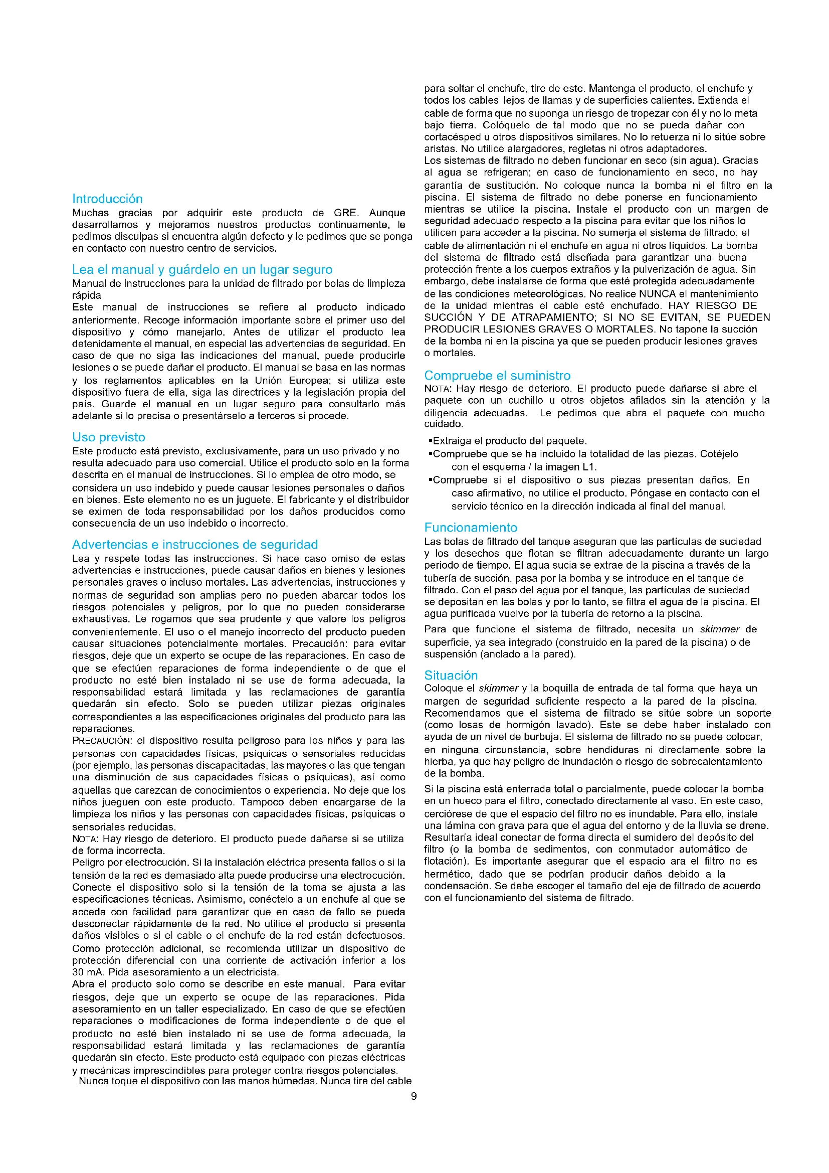 6ES IMAGEN 1 IMAGEN 2-3 7IMAGEN 4 IMAGEN E1/L1 (PARTES) IMAGEN 5 8Introducción Muchas gracias por adquirir este producto de GRE. Aunque desarrollamos y mejoramos nuestros productos continuamente, le pedimos disculpas si encuentra algún defecto y le pedimos que se ponga en contacto con nuestro centro de servicios. Lea el manual y guárdelo en un lugar seguro Manual de instrucciones para la unidad de filtrado por bolas de limpieza rápida Este manual de instrucciones se refiere al producto indicado anteriormente. Recoge información importante sobre el primer uso del dispositivo y cómo manejarlo. Antes de utilizar el producto lea detenidamente el manual, en especial las advertencias de seguridad. En caso de que no siga las indicaciones del manual, puede producirle lesiones o se puede dañar el producto. El manual se basa en las normas y los reglamentos aplicables en la Unión Europea; si utiliza este dispositivo fuera de ella, siga las directrices y la legislación propia del país. Guarde el manual en un lugar seguro para consultarlo más adelante si lo precisa o presentárselo a terceros si procede. Uso previsto Este producto está previsto, exclusivamente, para un uso privado y no resulta adecuado para uso comercial. Utilice el producto solo en la forma descrita en el manual de instrucciones. Si lo emplea de otro modo, se considera un uso indebido y puede causar lesiones personales o daños en bienes. Este elemento no es un juguete. El fabricante y el distribuidor se eximen de toda responsabilidad por los daños producidos como consecuencia de un uso indebido o incorrecto. Advertencias e instrucciones de seguridad Lea y respete todas las instrucciones. Si hace caso omiso de estas advertencias e instrucciones, puede causar daños en bienes y lesiones personales graves o incluso mortales. Las advertencias, instrucciones y normas de seguridad son amplias pero no pueden abarcar todos los riesgos potenciales y peligros, por lo que no pueden considerarse exhaustivas. Le rogamos que sea prudente y que valore los peligros convenientemente. El uso o el manejo incorrecto del producto pueden causar situaciones potencialmente mortales. Precaución: para evitar riesgos, deje que un experto se ocupe de las reparaciones. En caso de que se efectúen reparaciones de forma independiente o de que el producto no esté bien instalado ni se use de forma adecuada, la responsabilidad estará limitada y las reclamaciones de garantía quedarán sin efecto. Solo se pueden utilizar piezas originales correspondientes a las especificaciones originales del producto para las reparaciones.