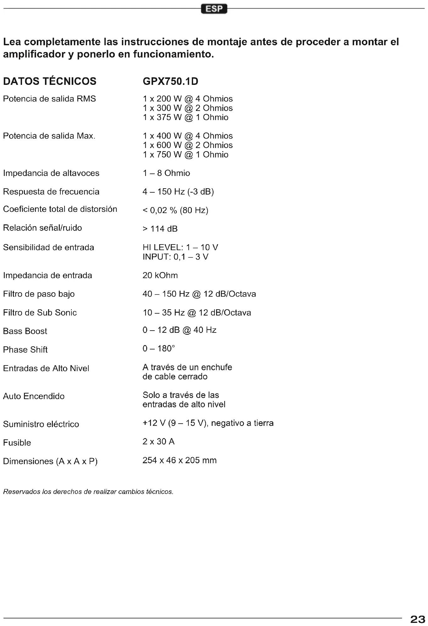 INPUT: 0,1 – 3 V 20 kOhm 40 – 150 Hz @ 12 dB/Octava 10 – 35 Hz @ 12 dB/Octava 0 – 12 dB @ 40 Hz 0 – 180° A través de un enchufe de cable cerrado Solo a través de las entradas de alto nivel +12 V (9 – 15 V), negativo a tierra 2 x 30 A 254 x 46 x 205 mm Reservados los derechos de realizar cambios técnicos. GPX750.1D24