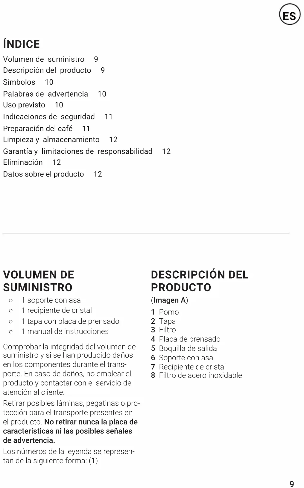 ÍNDICE Volumen de suministro 9 Descripción del producto 9 Símbolos 10 Palabras de advertencia 10 Uso previsto 10 Indicaciones de seguridad 11 Preparación del café 11 Limpieza y almacenamiento 12 Garantía y limitaciones de responsabilidad 12 Eliminación 12 Datos sobre el producto 12 VOLUMEN DE SUMINISTRO ○ 1 soporte con asa ○ 1 recipiente de cristal ○ 1 tapa con placa de prensado ○ 1 manual de instrucciones Comprobar la integridad del volumen de suministro y si se han producido daños en los componentes durante el trans- porte. En caso de daños, no emplear el producto y contactar con el servicio de atención al cliente. Retirar posibles láminas, pegatinas o pro- tección para el transporte presentes en el producto. No retirar nunca la placa de características ni las posibles señales de advertencia. Los números de la leyenda se represen- tan de la siguiente forma: (1)