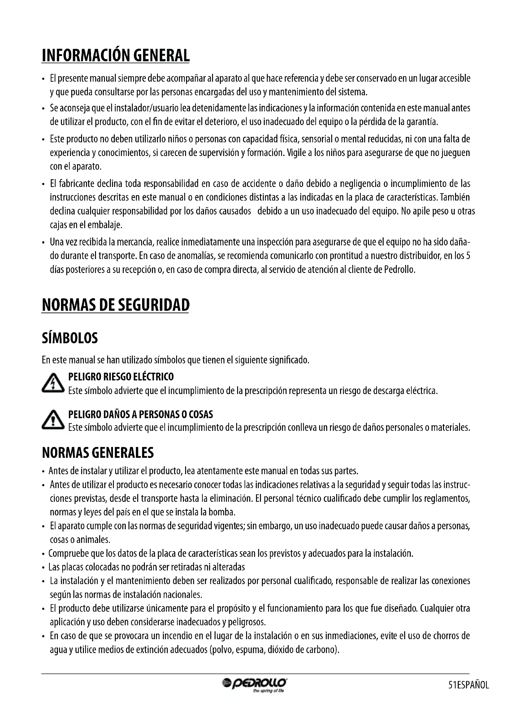 - Antes de utiliser el producto es必須o poderar todas las indicaciones relativas a la calidad y seguir todas las instruetiones previstas, desde el transporte hasta la eliminacion. El personal的技术icorialido debe complir los reglamentos, normas y leyes del pais en el que se instala la bomba.