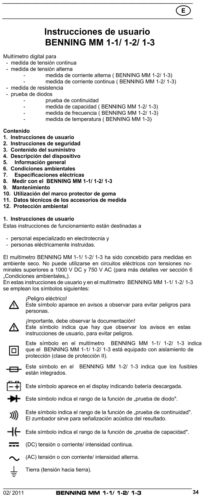 Instrucciones de usuario BENNING MM 1‑1/ 1‑2/ 1‑3 Multímetro digital para - medida de tensión continua - medida de tensión alterna - medida de corriente alterna ( BENNING MM 1-2/ 1-3) - medida de corriente continua ( BENNING MM 1-2/ 1-3) - medida de resistencia - prueba de diodos - prueba de continuidad - medida de capacidad ( BENNING MM 1-2/ 1-3) - medida de frecuencia ( BENNING MM 1-2/ 1-3) - medida de temperatura ( BENNING MM 1-3) Contenido
