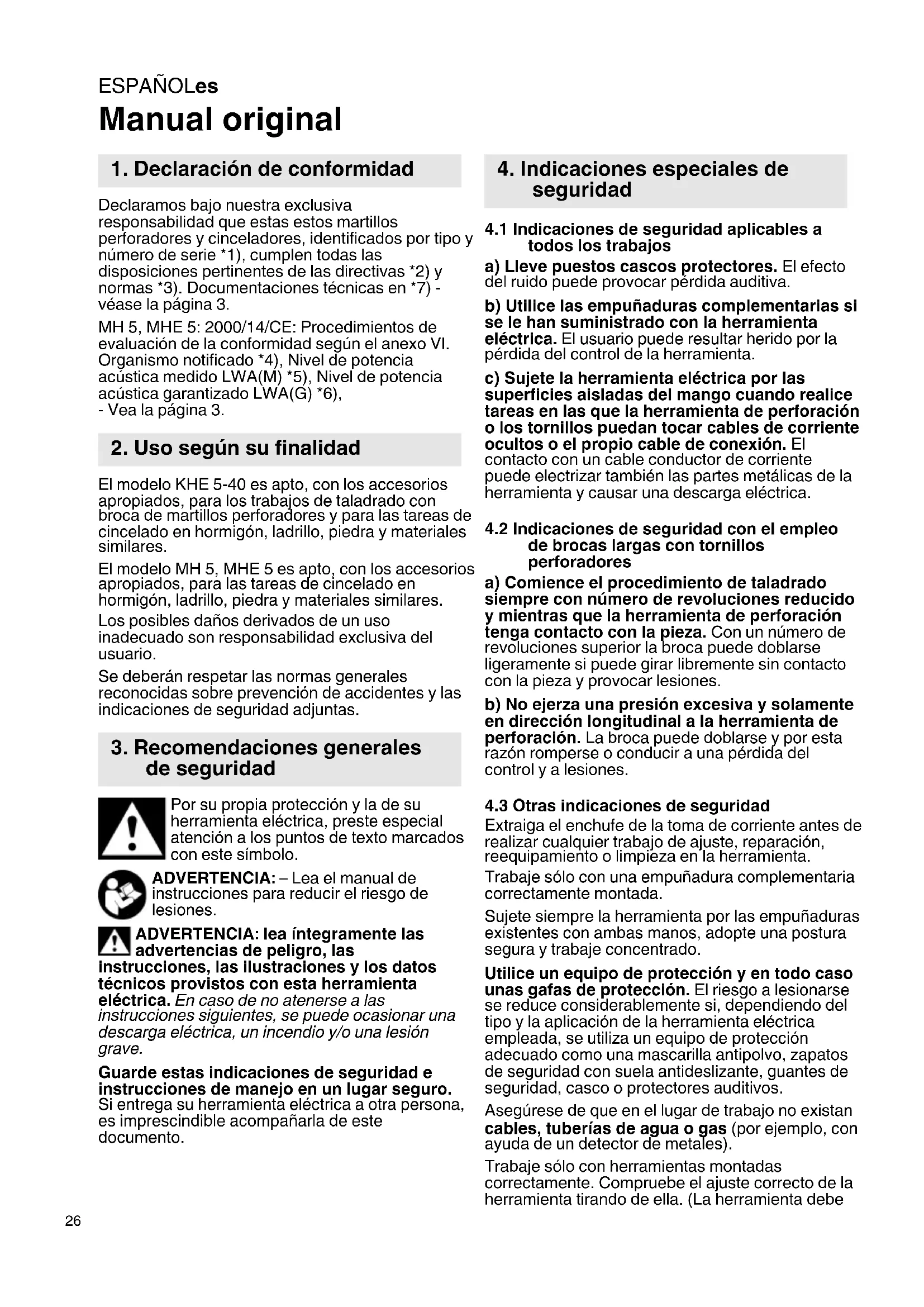 El Modelo MH 5, MHE 5 es apto, con los accesos apropriados, para las tareas de cincelado en hormigón, ladrillo, piedra y materiales similares. Los posibles daños derivados de un uso inadequado son responsabilidad exclusiva del usuario.