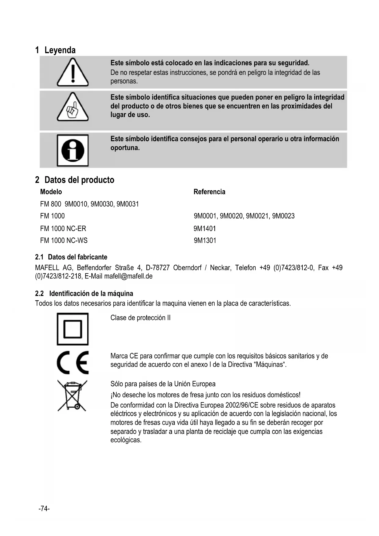 Este símbolo identifica consejos para el personal operario u otra información oportuna. 2 Datos del producto Modelo Referencia FM 800 9M0010, 9M0030, 9M0031 FM 1000 9M0001, 9M0020, 9M0021, 9M0023 FM 1000 NC-ER 9M1401 FM 1000 NC-WS 9M1301