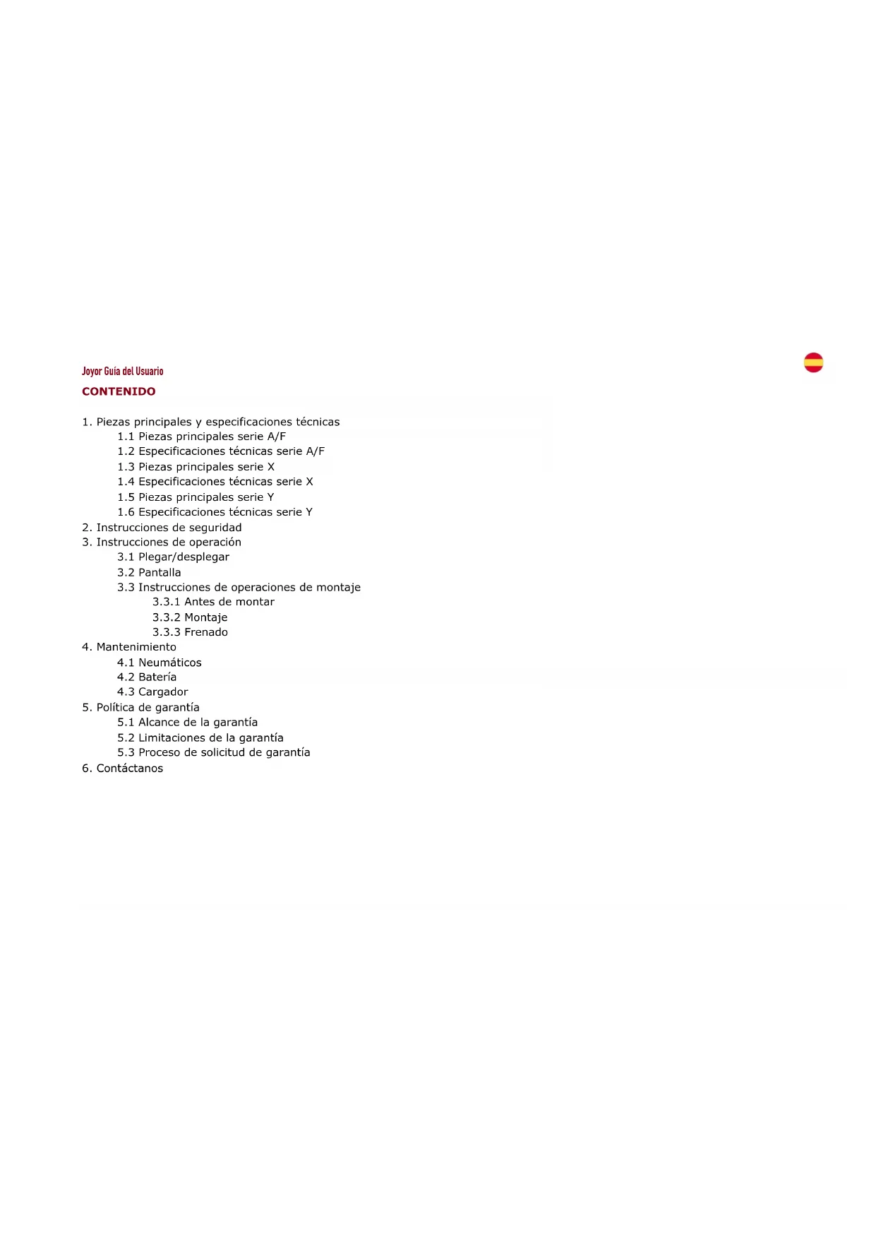 Esta garantía limitada cubre cualquier defecto de material o mano de obra en los nuevos dispositivos Joyor acompañados por esta declaración de garantía limitada por un período de 24 meses después de la primera compra al por menor para las partes no eléctricas y para el patinete eléctrico y por un período de 12 meses para la batería, bajo instalación normal, uso, servicio y mantenimientoJoyor Guía del Usuario Solo los consumidores que compran este dispositivo a un distribuidor o revendedor autorizado de Joyor pueden obtener cobertura bajo esta garantía limitada.