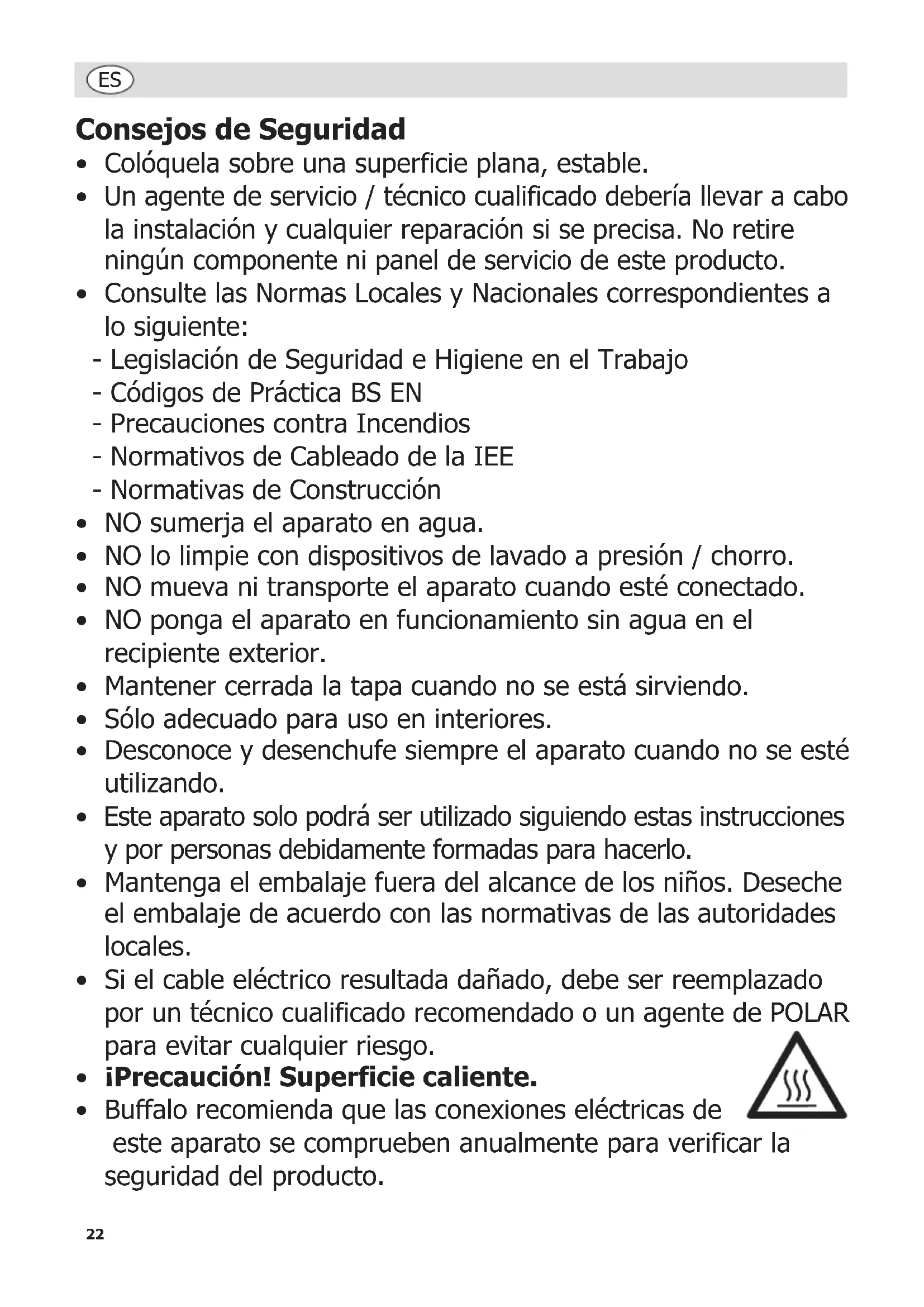 Resolución de problemas Fallo Probable Causa Acción El aparato no funciona El aparato no está conectado Compruebe que el aparato esté enchufado correctamente y conectado El enchufe y el cable están dañados Llame a un técnico cualificado o a un agente de Buffalo El fusible del enchufe se ha fundido Cambie el fusible del enchufe Suministro eléctrico Compruebe el suministro eléctrico Fallo del cableado interno Llame a un técnico cualificado o a un agente de Buffalo La sopa no se calienta Temperatura insuficiente Aumente el ajuste de la temperatura Cableado Eléctrico El enchufe tiene que conectarse a una toma eléctrica adecuada. Este aparato está conectado de la forma siguiente: