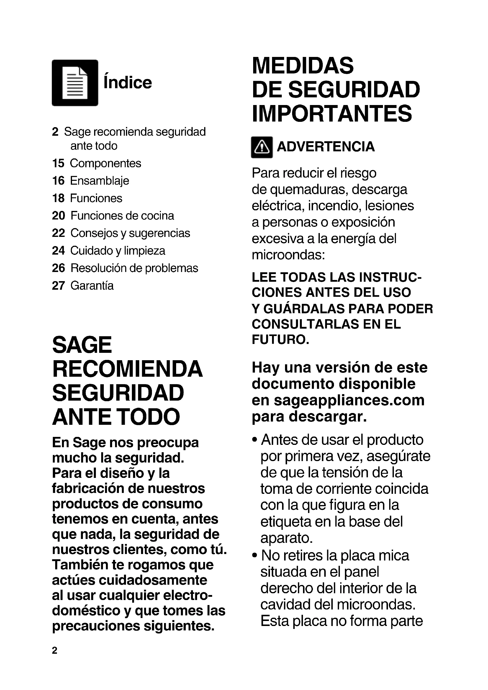 SAGE RECOMIENDA SEGURIDAD ANTE TODO En Sage nos preocupa mucho la seguridad. Para el diseño y la fabricación de nuestros productos de consumo tenemos en cuenta, antes que nada, la seguridad de nuestros clientes, como tú. También te rogamos que actúes cuidadosamente al usar cualquier electro- doméstico y que tomes las precauciones siguientes. MEDIDAS DE SEGURIDAD IMPORTANTES ADVERTENCIA Para reducir el riesgo de quemaduras, descarga eléctrica, incendio, lesiones a personas o exposición excesiva a la energía del microondas: