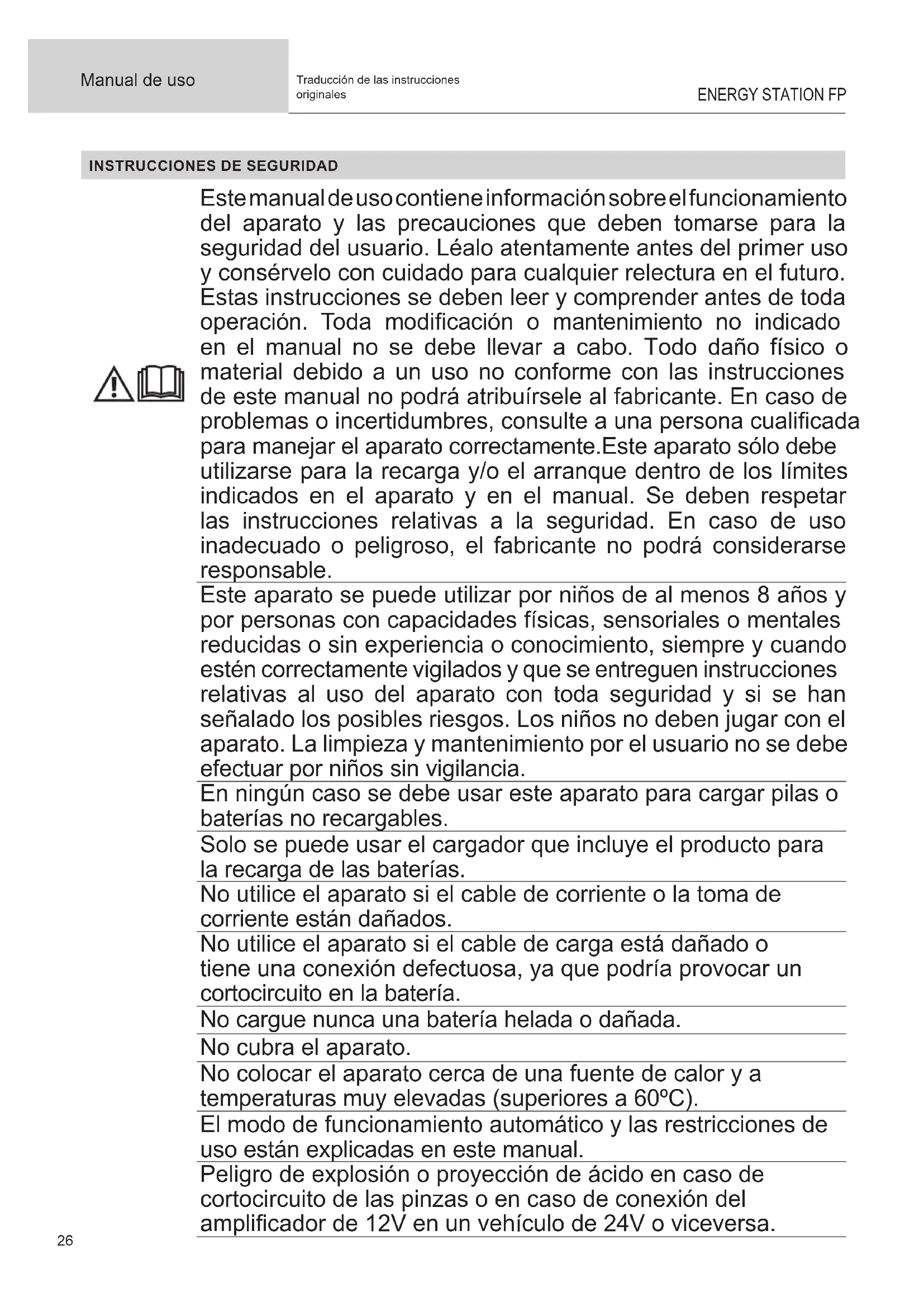 Este manual de uso contiene información sobre el funcionamiento del aparato y las precauciones que deben tomarse para la seguridad del usuario. Léalo atentamente antes del primer uso y consérvelo con cuidado para cualquier relectura en el futuro. Estas instrucciones se deben leer y comprender antes de toda operación. Toda modicación o mantenimiento no indicado en el manual no se debe llevar a cabo. Todo daño físico o material debido a un uso no conforme con las instrucciones de este manual no podrá atribuírsele al fabricante. En caso de problemas o incertidumbres, consulte a una persona cualicada para manejar el aparato correctamente.Este aparato sólo debe utilizarse para la recarga y/o el arranque dentro de los límites indicados en el aparato y en el manual. Se deben respetar las instrucciones relativas a la seguridad. En caso de uso inadecuado o peligroso, el fabricante no podrá considerarse responsable. Este aparato se puede utilizar por niños de al menos 8 años y por personas con capacidades físicas, sensoriales o mentales reducidas o sin experiencia o conocimiento, siempre y cuando estén correctamente vigilados y que se entreguen instrucciones relativas al uso del aparato con toda seguridad y si se han señalado los posibles riesgos. Los niños no deben jugar con el aparato. La limpieza y mantenimiento por el usuario no se debe efectuar por niños sin vigilancia. En ningún caso se debe usar este aparato para cargar pilas o baterías no recargables. Solo se puede usar el cargador que incluye el producto para la recarga de las baterías. No utilice el aparato si el cable de corriente o la toma de corriente están dañados. No utilice el aparato si el cable de carga está dañado o tiene una conexión defectuosa, ya que podría provocar un cortocircuito en la batería. No cargue nunca una batería helada o dañada. No cubra el aparato. No colocar el aparato cerca de una fuente de calor y a temperaturas muy elevadas (superiores a 60ºC). El modo de funcionamiento automático y las restricciones de uso están explicadas en este manual. Peligro de explosión o proyección de ácido en caso de cortocircuito de las pinzas o en caso de conexión del amplicador de 12V en un vehículo de 24V o viceversa.ES