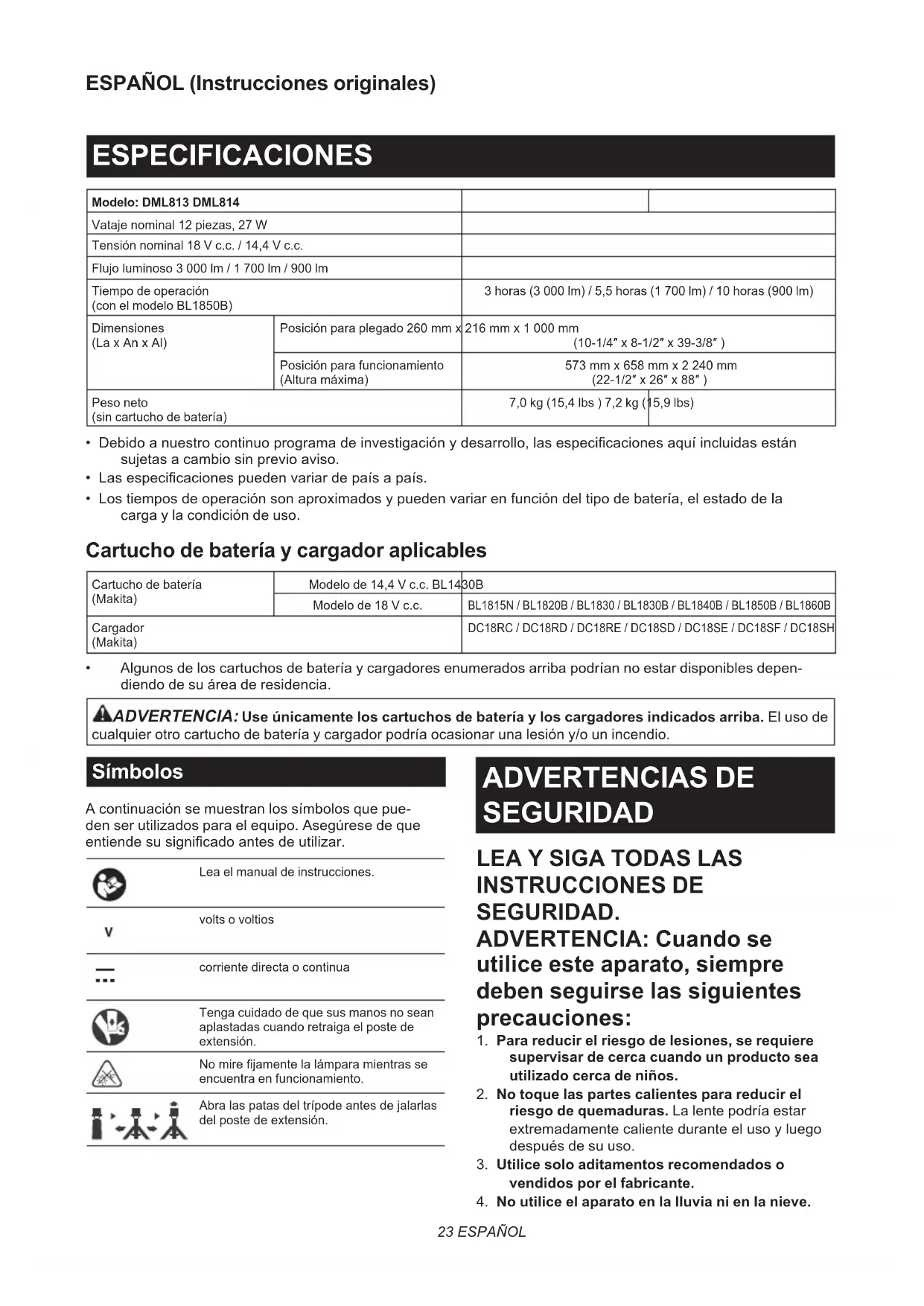 - Algunos de los cartuchos de batería y cargadores enumerados arriba podrían no estar disponibles depen- diendo de su área de residencia. ADVERTENCIA: Use únicamente los cartuchos de batería y los cargadores indicados arriba. El uso de cualquier otro cartucho de batería y cargador podría ocasionar una lesión y/o un incendio. Símbolos A continuación se muestran los símbolos que pue- den ser utilizados para el equipo. Asegúrese de que entiende su signicado antes de utilizar. Lea el manual de instrucciones.volts o voltioscorriente directa o continuaTenga cuidado de que sus manos no sean aplastadas cuando retraiga el poste de extensión.No mire jamente la lámpara mientras se encuentra en funcionamiento.Abra las patas del trípode antes de jalarlas del poste de extensión. ADVERTENCIAS DE SEGURIDAD