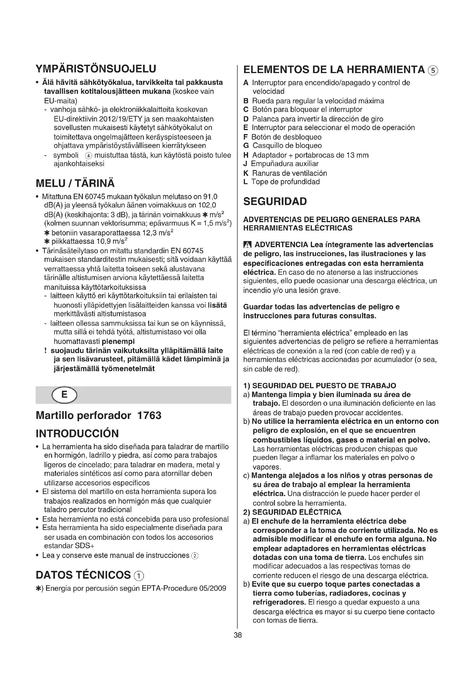 A Interruptor para encendido/apagado y control de velocidad B Rueda para regular la velocidad máxima C Botón para bloquear el interruptor D Palanca para invertir la dirección de giro E Interruptor para seleccionar el modo de operación F Botón de desbloqueo G Casquillo de bloqueo H Adaptador + portabrocas de 13 mm J Empuñadura auxiliar K Ranuras de ventilación L Tope de profundidad SEGURIDAD