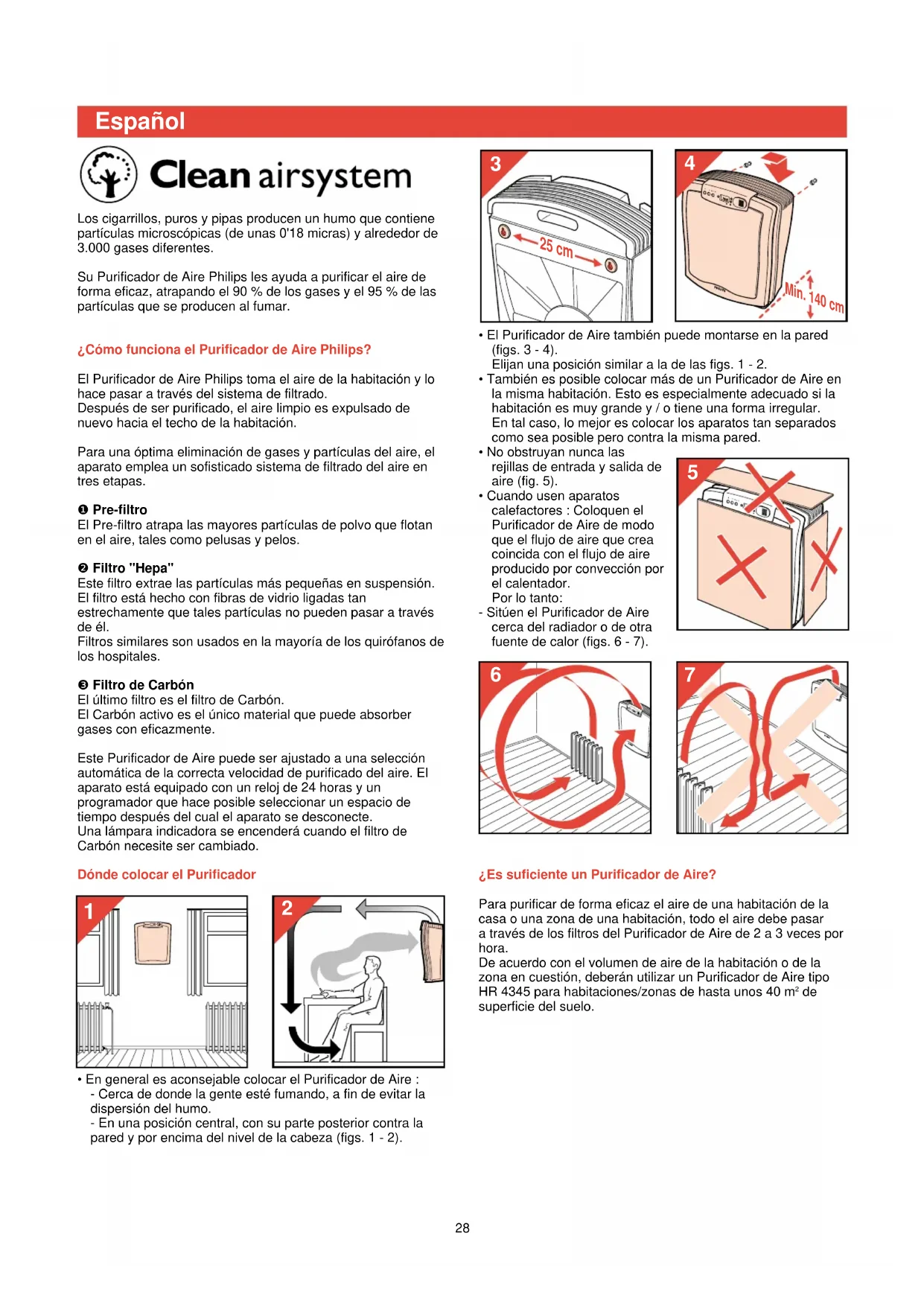 27• El Purificador de Aire también puede montarse en la pared(figs. 3 - 4).Elijan una posición similar a la de las figs. 1 - 2.• También es posible colocar más de un Purificador de Aire enla misma habitación. Esto es especialmente adecuado si lahabitación es muy grande y / o tiene una forma irregular. En tal caso, lo mejor es colocar los aparatos tan separadoscomo sea posible pero contra la misma pared.• No obstruyan nunca lasrejillas de entrada y salida deaire (fig. 5).• Cuando usen aparatoscalefactores : Coloquen elPurificador de Aire de modoque el flujo de aire que creacoincida con el flujo de aireproducido por convección porel calentador.Por lo tanto: - Sitúen el Purificador de Airecerca del radiador o de otrafuente de calor (figs. 6 - 7).¿Es suficiente un Purificador de Aire?Para purificar de forma eficaz el aire de una habitación de lacasa o una zona de una habitación, todo el aire debe pasar a través de los filtros del Purificador de Aire de 2 a 3 veces porhora. De acuerdo con el volumen de aire de la habitación o de lazona en cuestión, deberán utilizar un Purificador de Aire tipoHR 4345 para habitaciones/zonas de hasta unos 40 m