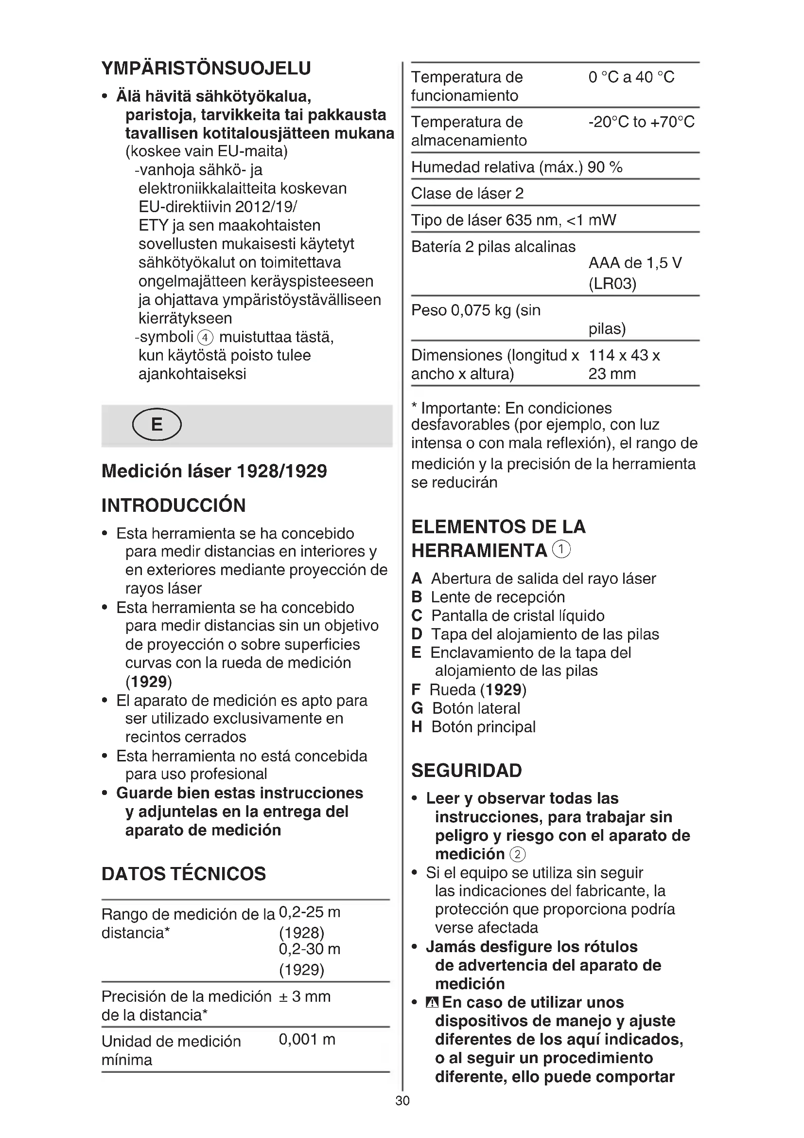 Rango de medición de la distancia* 0,2-25 m (1928) 0,2-30 m (1929) Precisión de la medición de la distancia* ± 3 mm Unidad de medición mínima 0,001 m31 - siempre sustituya todas las pilas al mismo tiempo - utilice pilas del mismo fabricante e igual capacidad - cierre la tapa del compartimento de las pilas D - saque las pilas del aparato de medición si pretende no utilizarlo durante largo tiempo (tras un tiempo de almacenaje prolongado, las pilas se pueden llegar a corroer y autodescargar)