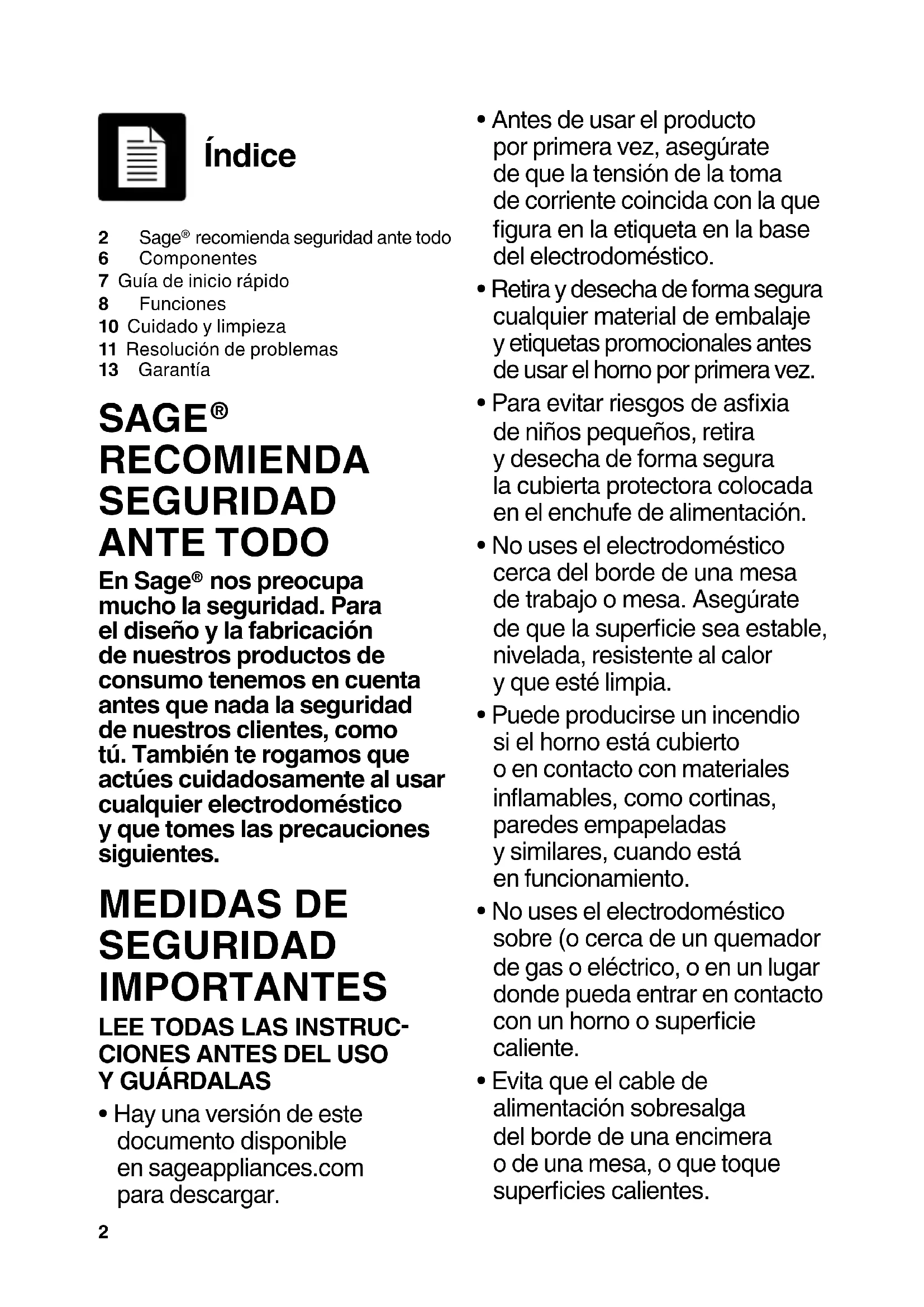 recomienda seguridad ante todo 6 Componentes 7 Guía de inicio rápido 8 Funciones 10 Cuidado y limpieza 11 Resolución de problemas 13 Garantía SAGE