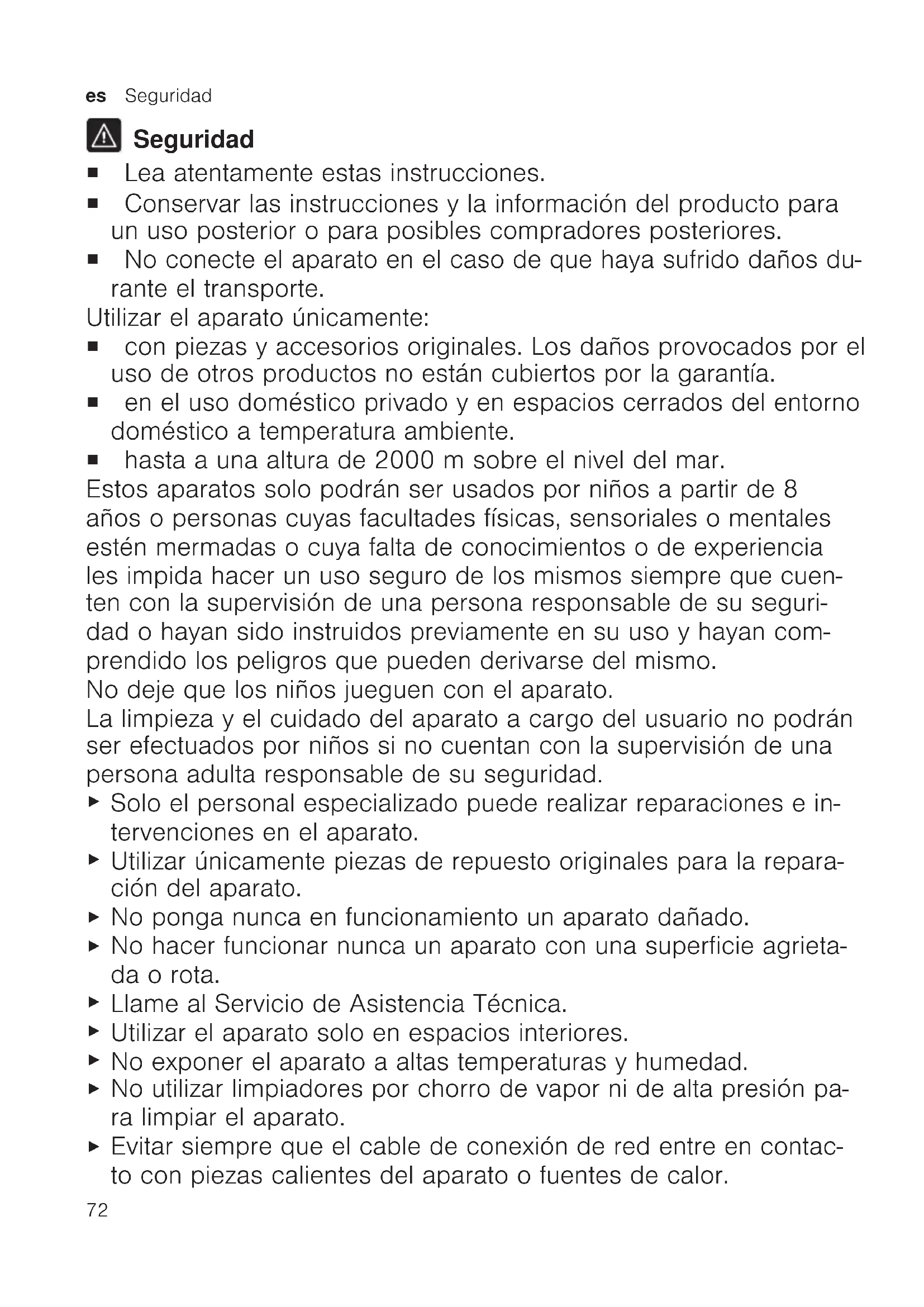 Seguridad ¡ Lea atentamente estas instrucciones. ¡ Conservar las instrucciones y la información del producto para un uso posterior o para posibles compradores posteriores. ¡ No conecte el aparato en el caso de que haya sufrido daños du- rante el transporte. Utilizar el aparato únicamente: ¡ con piezas y accesorios originales. Los daños provocados por el uso de otros productos no están cubiertos por la garantía. ¡ en el uso doméstico privado y en espacios cerrados del entorno doméstico a temperatura ambiente. ¡ hasta a una altura de 2000msobre el nivel del mar. Estos aparatos solo podrán ser usados por niños a partir de 8 años o personas cuyas facultades físicas, sensoriales o mentales estén mermadas o cuya falta de conocimientos o de experiencia les impida hacer un uso seguro de los mismos siempre que cuen- ten con la supervisión de una persona responsable de su seguri- dad o hayan sido instruidos previamente en su uso y hayan com- prendido los peligros que pueden derivarse del mismo. No deje que los niños jueguen con el aparato. La limpieza y el cuidado del aparato a cargo del usuario no podrán ser efectuados por niños si no cuentan con la supervisión de una persona adulta responsable de su seguridad.