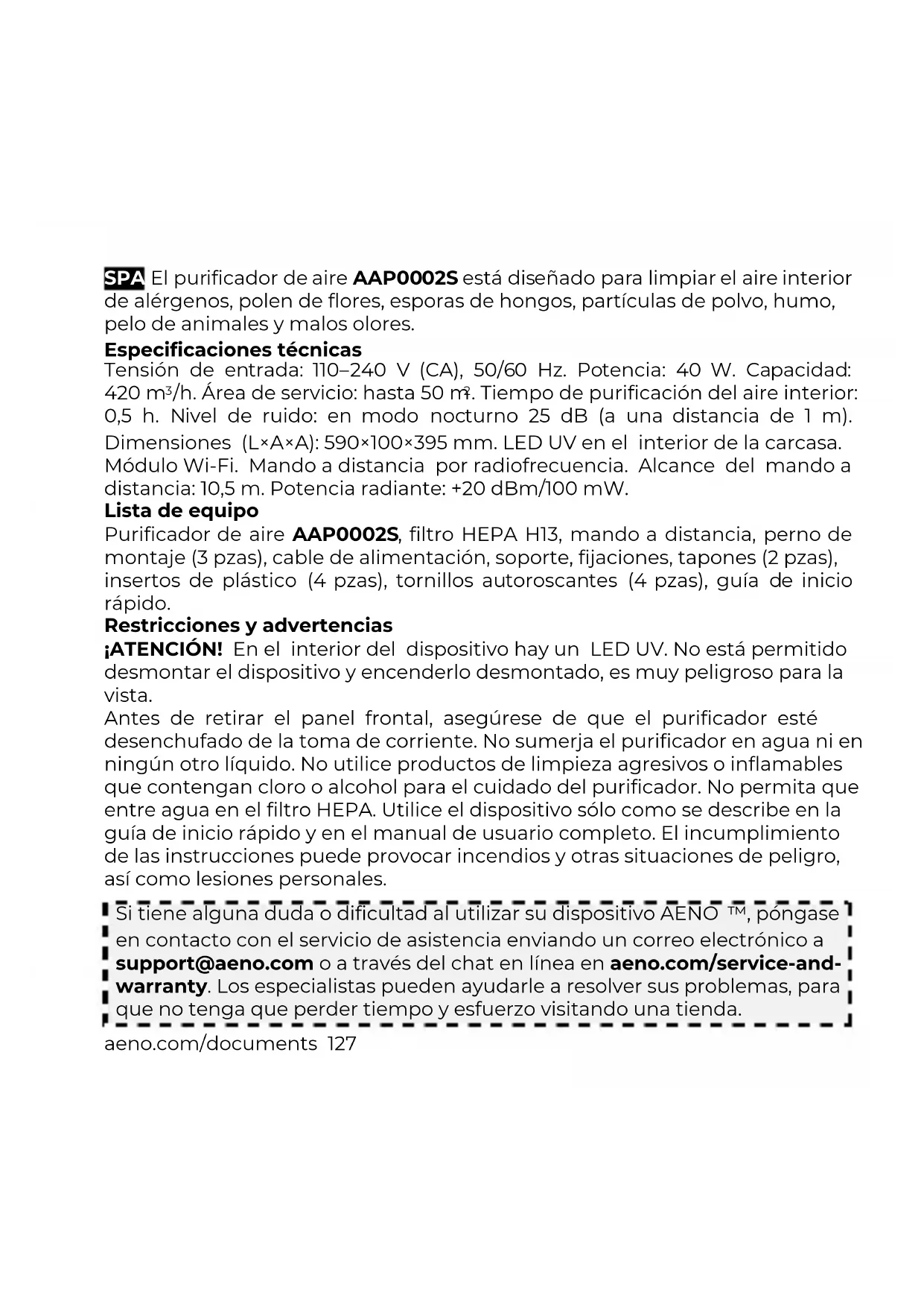 , póngase en contacto con el servicio de asistencia enviando un correo electrónico a support@aeno.com o a través del chat en línea en aeno.com/service-and- warranty. Los especialistas pueden ayudarle a resolver sus problemas, para que no tenga que perder tiempo y esfuerzo visitando una tienda.128 aeno.com/documents No utilice el dispositivo si está dañado o agrietado. No instale el dispositivo al aire libre o cerca de fuentes de agua, incluyendo humidificadores. No exponga el dispositivo a la luz solar directa, a la humedad o a las vibraciones. No deje caer, no tire, no desmonte y no intente reparar el dispositivo usted mismo. No coloque el cable cerca de radiadores, cocinas o calentadores. No utilice productos de limpieza o detergentes para limpiar el dispositivo. No elimine el dispositivo junto con los residuos municipales sin clasificar, ya que sería perjudicial para el medio ambiente. Para obtener más información sobre la eliminación adecuada, póngase en contacto con su organización local de recogida y eliminación de residuos. No permita que los niños jueguen con el dispositivo. Existe riesgo de lesiones graves y descarga eléctrica. Este dispositivo está destinado exclusivamente al uso de adultos. Las advertencias, precauciones e instrucciones de este documento no pueden cubrir todas las posibles situaciones de peligro. Se debe utilizar el sentido común al utilizar el dispositivo. Elementos del purificador de aire (véase la fig. a) (1) – entrada de aire, (2) – panel frontal desmontable, (3) – filtro HEPA, (4) – tapones de plástico, (5) – orificios de salida de aire purificado, (6) – carcasa, (7) – pernos de montaje, (8) – soporte, (9) – fijación mural. Preparación del dispositivo para el funcionamiento (véase la fig. a) Retire el embalaje del filtro HEPA antes de utilizarlo. Para esto, asegúrese primero de que el purificador de aire esté desenchufado de la red eléctrica. A continuación, retire con cuidado el panel frontal (2), sujete los lazos de tela y levante el filtro HEPA (3) hacia fuera. Retire el embalaje del filtro. A continuación, vuelva a colocar el filtro HEPA (3) en su sitio y ciérrelo con el panel frontal (2). Hay dos opciones para instalar el purificador: en el soporte: inserte los tapones (4) en los extremos abiertos del soporte (8). Fije el soporte con los tres pernos de montaje (7) a la carcasa del purificador (6). en la pared: fije la fijación (9) en el lugar elegido de la pared (al menos a 170 cm del suelo). Atornille tres pernos de montaje (7) en la parte posterior de la carcasa del purificador (6). Inserte las cabezas de los pernos de montaje (7) de la parte posterior del purificador en las ranuras de la fijación (9) ya fijada a la pared.aeno.com/documents 129 Control desde el panel de control (véase la fig. b) El indicador de calidad del aire interior/la pantalla del temporizador muestra la calidad del aire interior o el tiempo de funcionamiento del purificador antes de que se desconecte el temporizador. El indicador muestra que se está produciendo la purificación UV del aire ambiente. El botón de velocidad permite cambiar con cada pulsación sucesiva la velocidad de los ventiladores del purificador, tal y como indica el indicador de velocidad del aire . El botón "Start/Stop" permite encender y apagar el purificador. El botón de modo de reposo pone el purificador en modo de reposo con una potencia mínima del ventilador, en el que todos los indicadores, excepto el botón de modo de reposo, se apagan. Pulse de nuevo el botón para salir de este modo. El botón de modo automático inicia uno de los tres modos de funcionamiento adecuados del purificador según una evaluación de la calidad del aire interior. El botón Wi-Fi activa el dispositivo Wi-Fi del purificador para controlarlo a distancia desde su teléfono inteligente. Más información en las instrucciones para conectar el purificador a la aplicación "AENO", disponibles en aeno.com/documents. El indicador cambia de color en función del nivel de contaminación del aire con compuestos orgánicos (colas, pinturas, barnices, disolventes, etc.). El botón del temporizador cambia el indicador de calidad del aire al modo de temporizador. Otras pulsaciones ajustan el tiempo de funcionamiento del temporizador: de 1 a 24 horas. El botón de bloqueo para niños se activa cuando se mantiene presionado durante 3 segundos. Todos los botones quedan inutilizables. Para recuperar el acceso a los botones, debe presionar y mantener presionado el botón durante 3 segundos nuevamente. Botón del ionizador enciende el ionizador, que elimina los malos olores. El botón de reinicio del filtro indica que ha llegado el momento de sustituir el filtro HEPA. Para que el botón deje de parpadear, manténgalo presionado durante 10 segundos. La cuenta atrás para el final del funcionamiento del filtro HEPA del purificador comenzará desde cero.130 aeno.com/documents Control del purificador con el mando a distancia (véase la fig. c) El mando a distancia dispone de los siguientes botones: encendido/ apagado, modo de reposo, temporizador, modo de funcionamiento automático, cambio de velocidad del ventilador . Solución de posibles problemas de funcionamiento El purificador no se enciende. Posibles causas y solución: compruebe si el purificador está enchufado y si hay corriente en la toma, si el disyuntor está conectado y si los fusibles están intactos, si el indicador rojo de cambio de filtro parpadea. La eliminación del polvo es deficiente. Posibles causas y solución: compruebe si la superficie del filtro no está obstruida, si no hay obstáculos que impidan la entrada o salida de aire, si se ha retirado el embalaje del filtro. Hay mucho ruido. Posibles causas y solución: compruebe si hay algo atascado en el ventilador o si la carcasa del purificador está inclinada. Si el ruido sigue siendo demasiado fuerte, pruebe a reducir la potencia del purificador con el botón de veloci