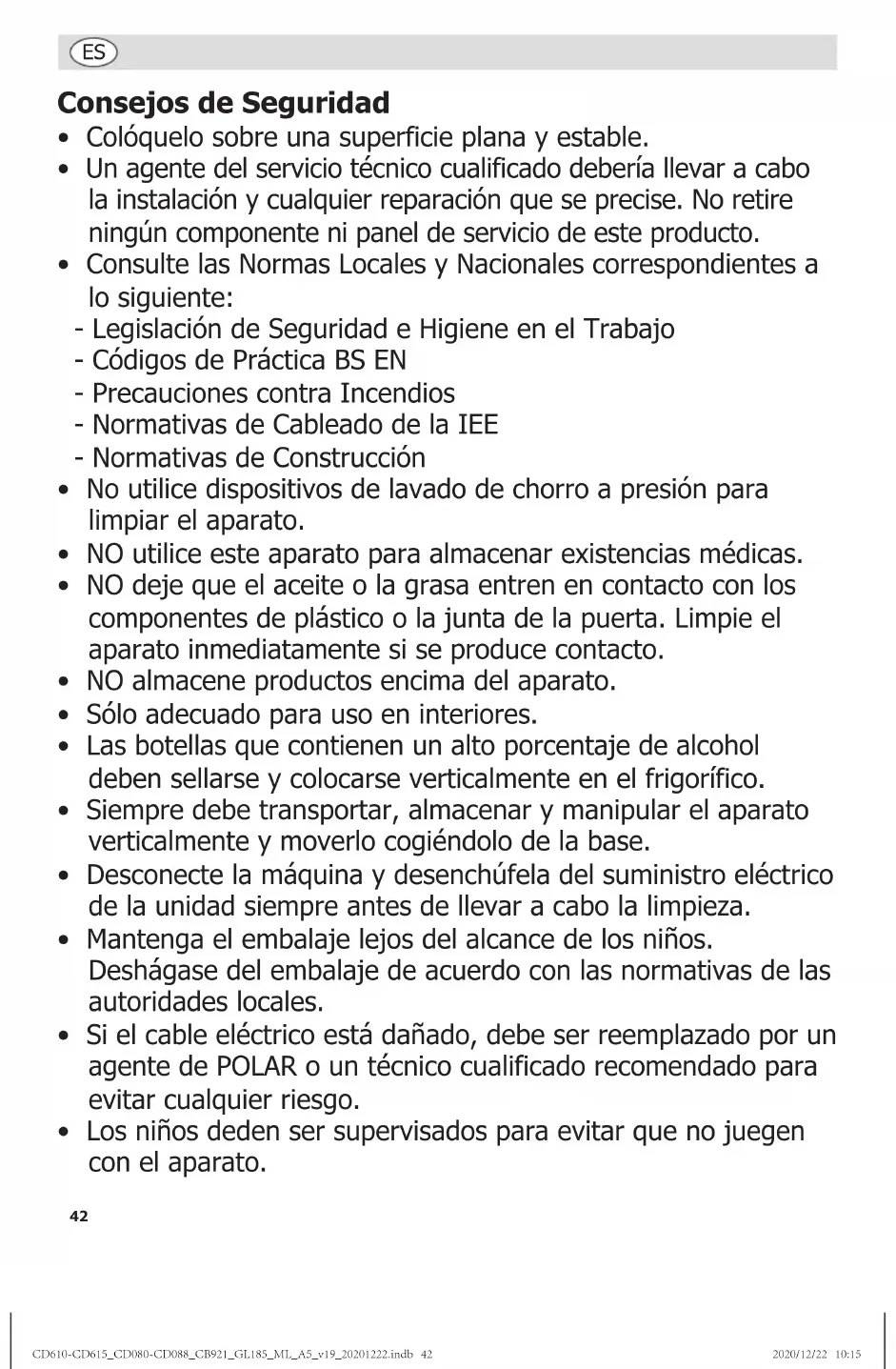 - Cable de tierra (de color verde / amarillo) al terminal marcado como E Este aparato debe conectarse a una toma de tierra. Si tiene alguna duda, consulte a un electricista cualificado. Los puntos de aislamiento eléctrico deben mantenerse libres de cualquier obstrucción. En caso de precisarse una desconexión de emergencia, deben estar disponibles de forma inmediata. Desecho Las normativas de la UE requieren que los productos de refrigeración sean desechados por compañías especializadas que extraigan o reciclen todos los gases, componentes metálicos y de plástico. Consulte a su autoridad local de recogida de residuos a la hora de desechar su aparato. Las autoridades locales no están obligadas a eliminar los equipos de refrigeración comerciales pero pueden ofrecer consejo sobre cómo desechar los equipos localmente. Otra opción es llamar a la línea de asistencia de POLAR para pedir información sobre las compañías nacionales de desechos de la UE. Cumplimiento El logotipo WEEE en este producto o su documentación indica que no debe eliminarse como un residuo doméstico. Para ayudar a prevenir posibles daños a la salud humana y/ o el medio ambiente, el producto debe eliminarse en un proceso de reciclaje aprobado y medioambientalmente seguro. Para obtener más información sobre cómo eliminar correctamente este producto, póngase en contacto con el proveedor del mismo o la autoridad local responsable de la eliminación de residuos en su zona. Las piezas POLAR han pasado estrictas pruebas de productos para cumplir las especificaciones y normas reguladoras establecidas por las autoridades internacionales, independientes y federales. Los productos POLAR han sido autorizados para llevar el símbolo siguiente: Reservados todos los derechos. Puede estar prohibida la reproducción o transmisión en cualquier forma o por cualquier medio electrónico, mecánico, de fotocopiado, registro o de otro tipo, de cualquier parte de estas instrucciones sin la autorización previa y por escrito de POLAR. Se ha hecho todo lo posible para garantizar que todos los datos son correctos en el momento de su publicación; sin embargo,POLAR se reserva el derecho a modificar las especificaciones sin que medie notificación previa. CD610-CD615_CD080-CD088_CB921_GL185_ML_A5_v19_20201222.indb 49CD610-CD615_CD080-CD088_CB921_GL185_ML_A5_v19_20201222.indb 49 2020/12/22 10:152020/12/22 10:1550