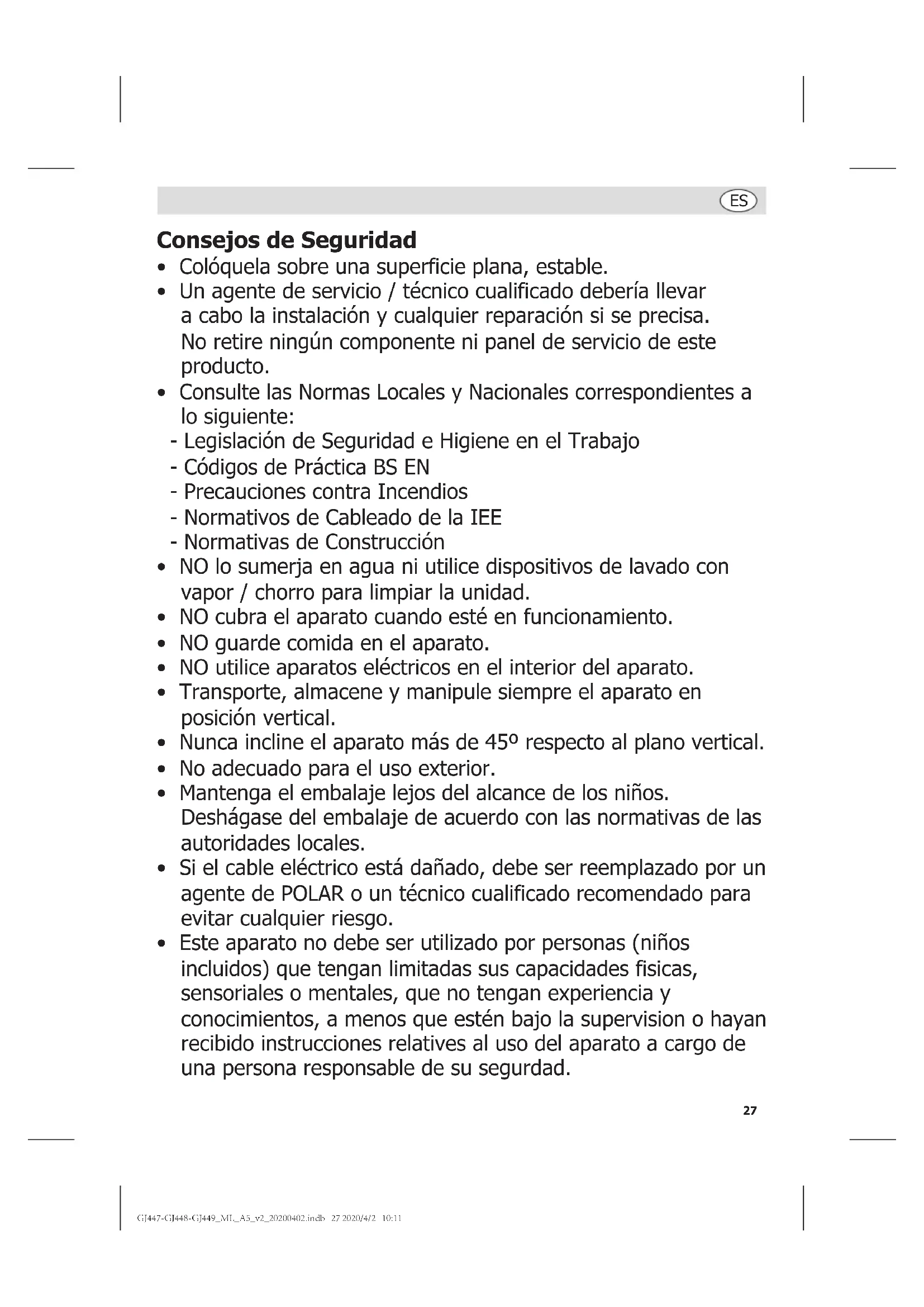 - Este aparato no debe ser utilizado por personas (niños incluidos) que tengan limitadas sus capacidades fisicas, sensoriales o mentales, que no tengan experiencia y conocimientos, a menos que estén bajo la supervision o hayan recibido instrucciones relatives al uso del aparato a cargo de una persona responsable de su segurdad. GJ447-GJ448-GJ449_ML_A5_v2_20200402.indb 27 2020/4/2 10:1128
