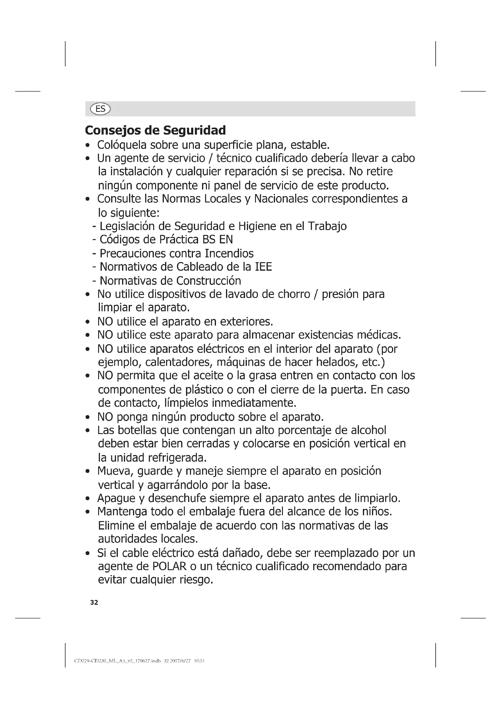 - Si el cable eléctrico está dañado, debe ser reemplazado por un agente de POLAR o un técnico cualificado recomendado para evitar cualquier riesgo. CD229-CD230_ML_A5_v2_170627.indb 32 2017/6/27 10:5133