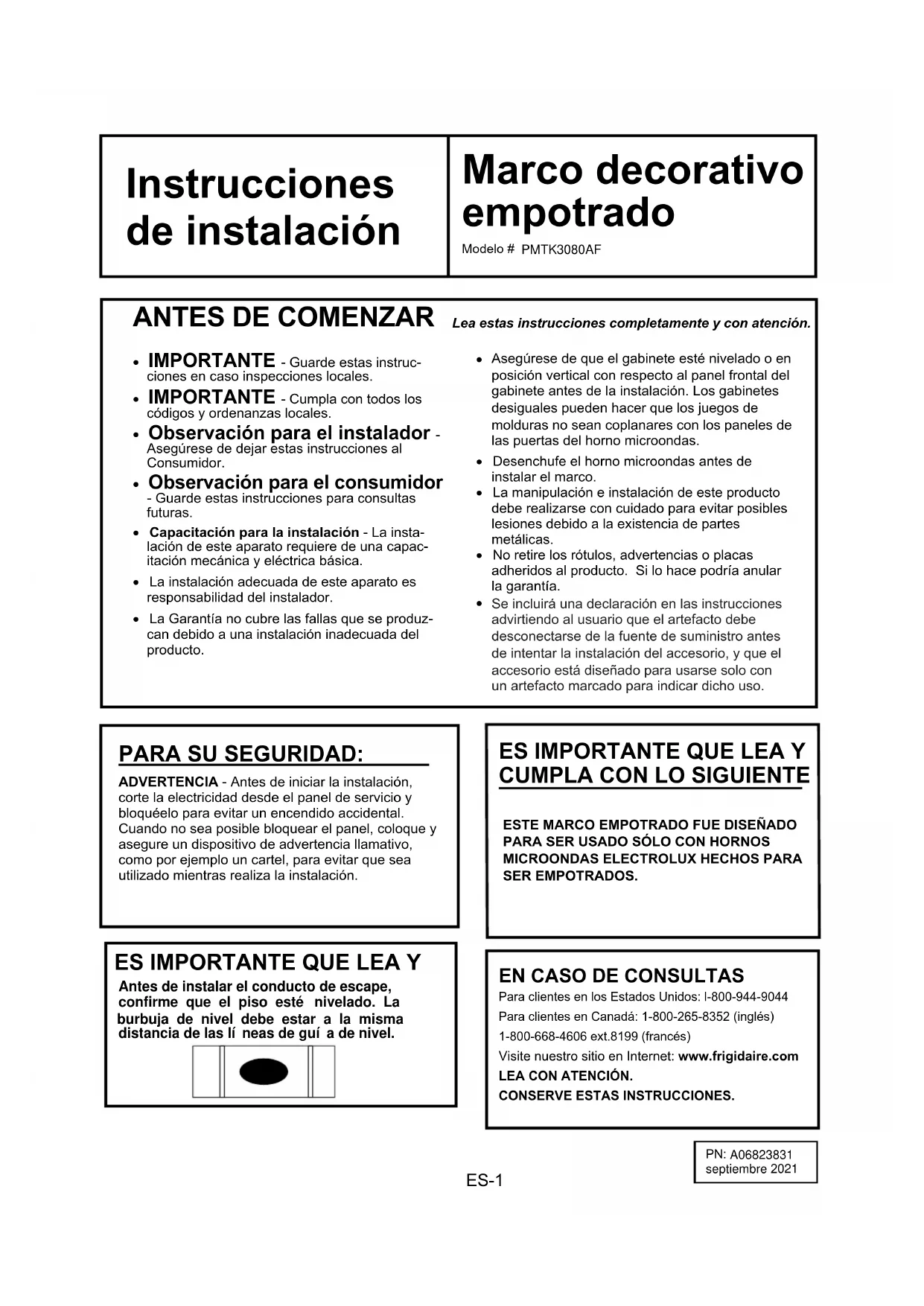 - Capacitación para la instalación - La insta- lación de este aparato requiere de una capac-itación mecánica y eléctrica básica.ADVERTENCIA - Antes de iniciar la instalación, corte la electricidad desde el panel de servicio y bloquéelo para evitar un encendido accidental.Cuando no sea posible bloquear el panel, coloque y asegure un dispositivo de advertencia llamativo, como por ejemplo un cartel, para evitar que sea utilizado mientras realiza la instalación.ESTE MARCO EMPOTRADO FUE DISEÑADO PARA SER USADO SÓLO CON HORNOS MICROONDAS ELECTROLUX HECHOS PARA SER EMPOTRADOS. Para clientes en los Estados Unidos: l-800-944-9044 Para clientes en Canadá: 1-800-265-8352 (inglés) 1-800-668-4606 ext.8199 (francés) Visite nuestro sitio en Internet: www.frigidaire.com LEA CON ATENCIÓN. CONSERVE ESTAS INSTRUCCIONES.